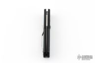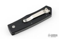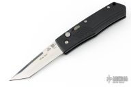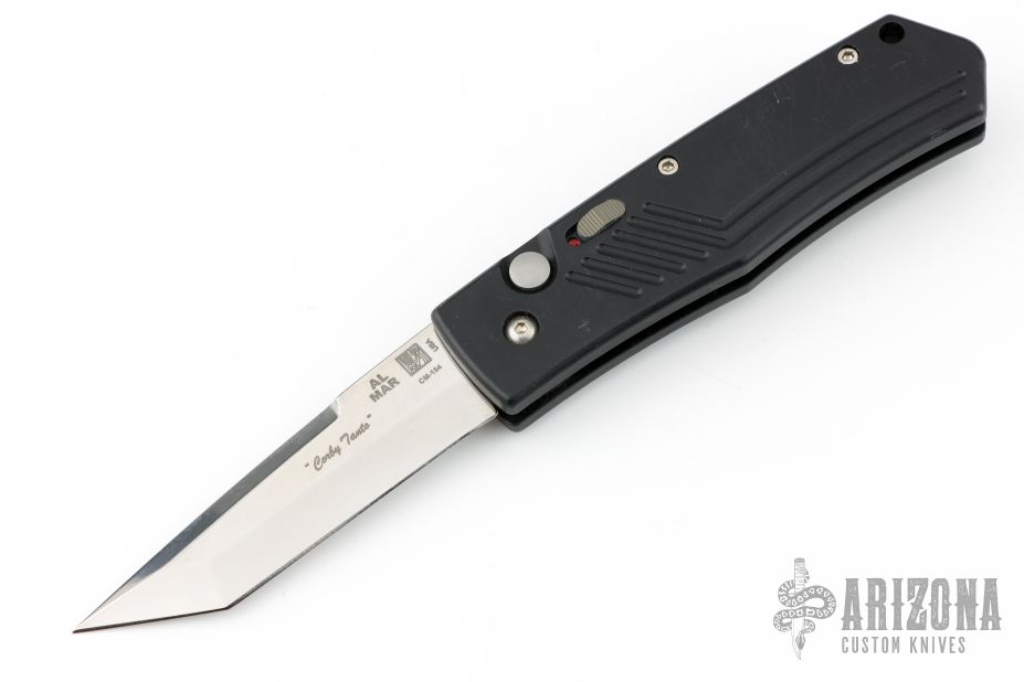 This Corby Tanto Auto by Al Mar Knives has a tumbled and polished drop point tanto blade with false top edge. Handle is black anodized aluminum with safety auto button, milled ribs, stainless steel tip up clip, and lanyard hole. Has a few light scuffs, excellent condition otherwise. Comes with original box.