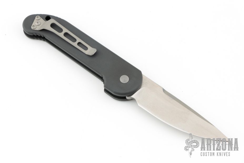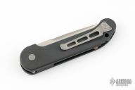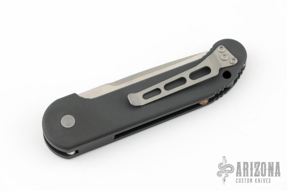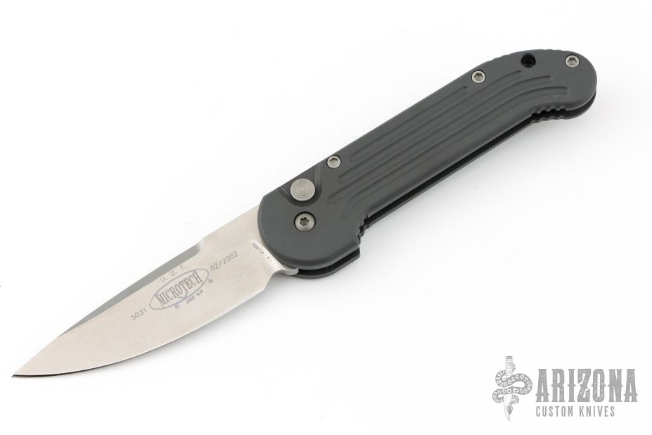 This UDT by Microtech has a stonewashed blade. The handle has a black aluminum frame with lanyard hole and tip up stainless steel clip. Side opening coil-spring automatic. Dated 02/2002. Serial# 5031. Excellent condition. Hard to find. Comes with original box, sheath and papers.