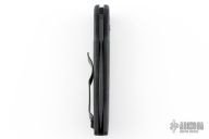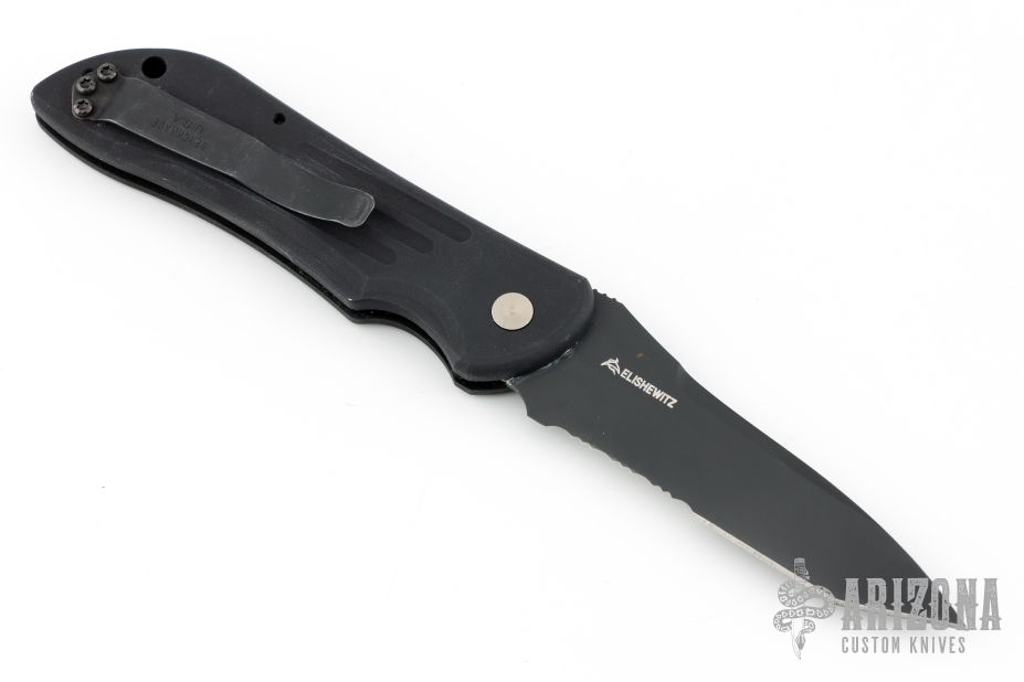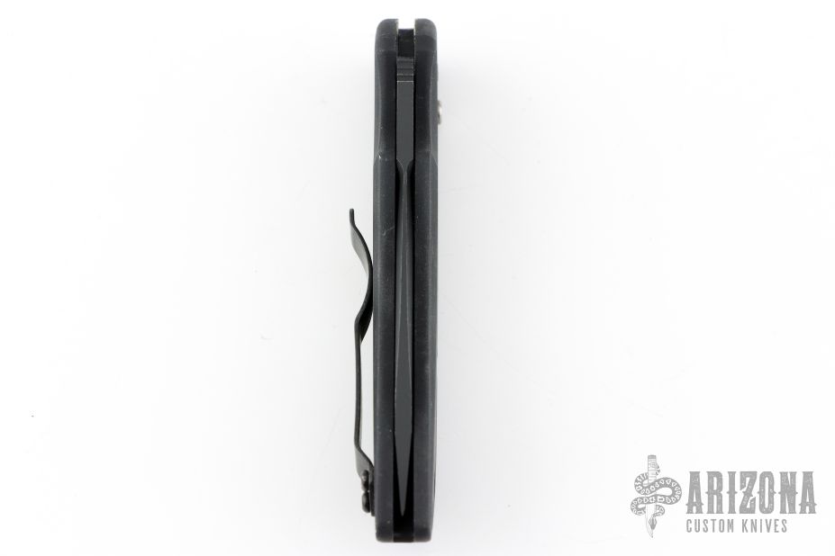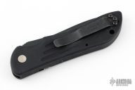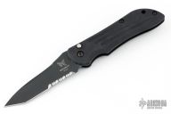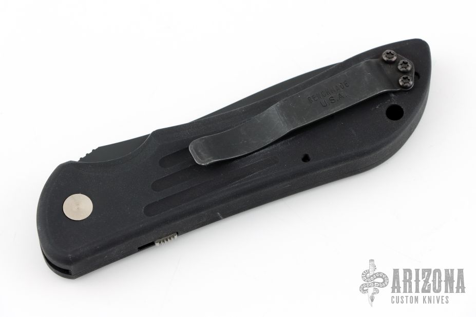The Model 9100 AutoStryker is the automatic version of Benchmade's Designer Series Stryker. Designed by Allen Elishewitz, the AutoStryker features a 3.5" 154CM drop point Tanto blade. The handle is made from 6061 T6 aircraft aluminum, hard anodized black for durability. This knife is designed for people who like the features of the Tanto blade shape, but do not want a chisel ground blade; the knife has a double bevel and is symetrically ground. This one has a partially serrated black coated blade. Good strong action. Black tip up carry clip. Has a couple light scuffs, otherwise excellent condition. Comes with original box and papers.