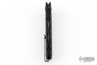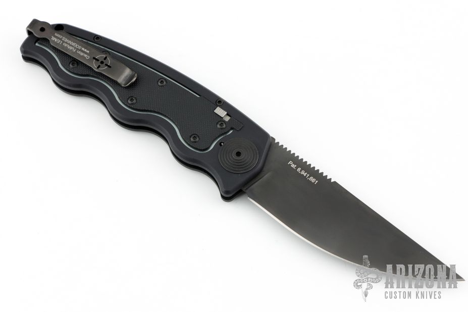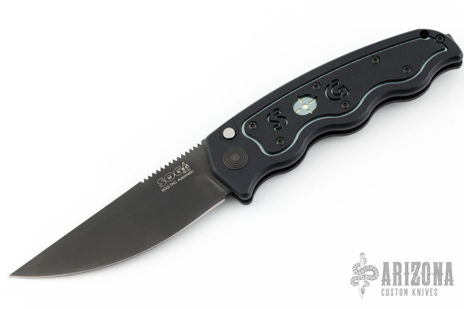 This SOG-TAC Auto has a black finish upswept blade with notched thumb rest. Handle is black anodized aluminum with safety, lanyard hole, and stainless steel tip up clip - RH/ LH reversible. Comes with original box and papers. Excellent condition.