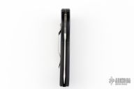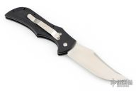 This Apex auto has a satin finished blade with notched thumbrest and false top edge. Handle is black anodized aluminum with a push button, tip down stainless steel clip. Has a couple light scuffs, otherwise excellent condition. Comes with original box.