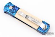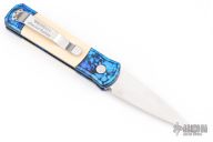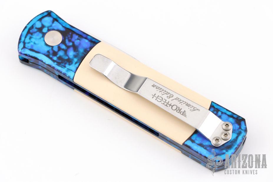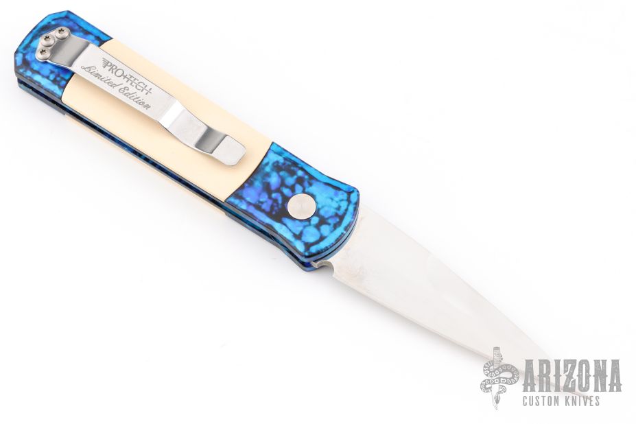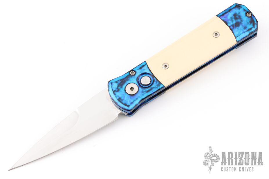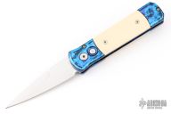 This Godson from Pro-Tech knives features a mirror finish spear point blade with swedge. The handle has a "Jazz" aluminum frame with ivory paper micarta scales, stainless steel tip up pocket clip. Great blade seating, action and lock up.  Includes original packaging and paperwork.  Excellent condition.