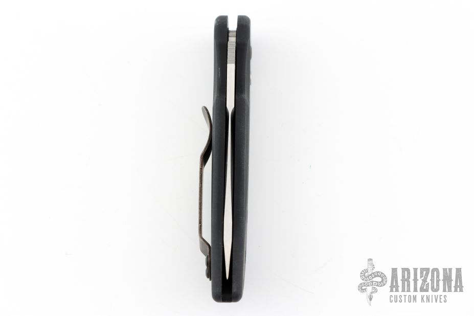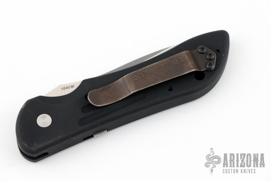 This 9500S Mini Auto-Stryker from Benchmade features a satin finished tanto blade with partial serrations and notched thumbrest. The handle is comprised of black anodized and machined aluminum with black coated stainless steel tip up clip and lanyard hole in pommel. Push button release and sliding safety. Comes with original box and papers. Excellent condition.
