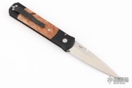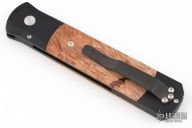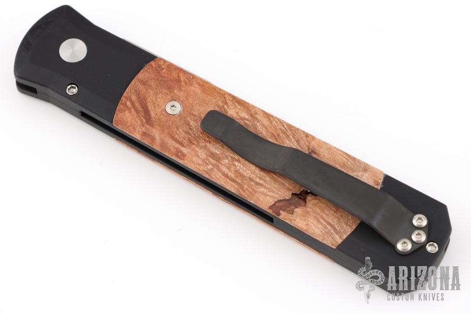 The Godfather 4" blade auto knife represents the influence of original Italian "Stiletto" style auto knife and Pro-Tech's modern coil spring precision. This Godfather has a satin finish blade and maple burl wood inlays in the black aluminum handle with tip up black stainless clip. Includes original box and paperwork. Excellent condition.