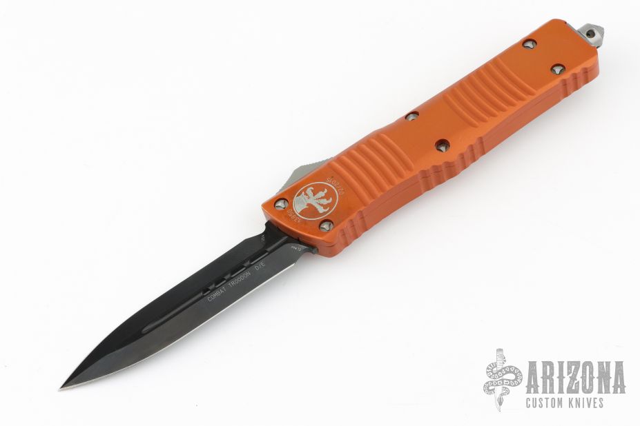 This Combat Troodon by Microtech Knives features a black double edged blade. The handle has an orange aluminum frame with tip down black stainless steel clip and hardware. S/N 13950 and dated 02/2015. Has scuffs and scratches throughout. Good user condition.