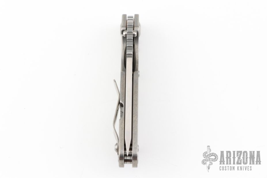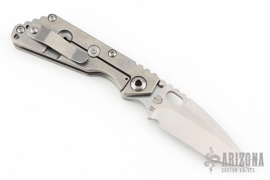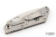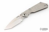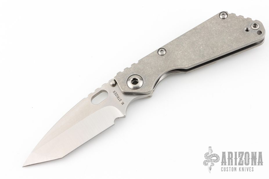 This Mick Strider Performance series SNG framelock folder features a satin finished tanto blade with thumbhole and notched thumbrest. The handle has a stonewashed titanium frame with titanium deep carry clip, tip up carry. Jimping on blade spine. Includes Hinderer "Lock Bar Stabilizer" for maximum reverse lock retention. Excellent lockup, detent, and blade seating. New Condition.