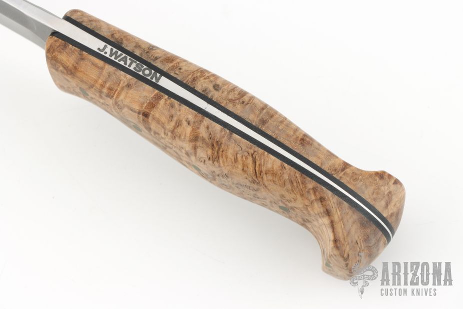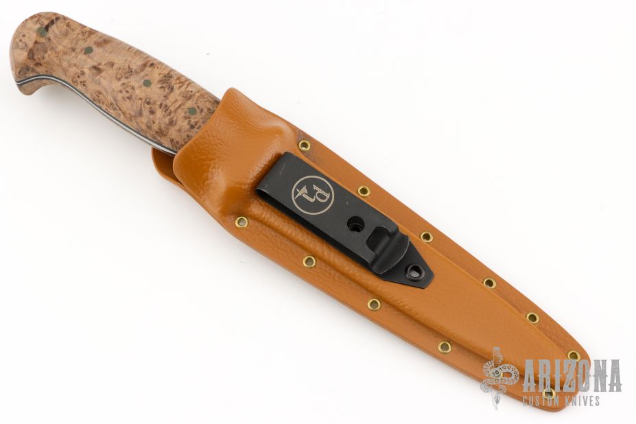 5/32" thick MagnaCut Steel w/ Lightening Fuller & False Edge Spine. Matte Field Use Blade Finish. The Tang has a Drastic Taper. Handle is Birch Burl Wood w/ black liners, Center Swell and Pommel Flare Contour. Approximately 9.5" Overall w/ 5" Blade. Fully rounded and domed for ergonomic function. Includes Field Tan Tracker Dan Sheath
