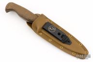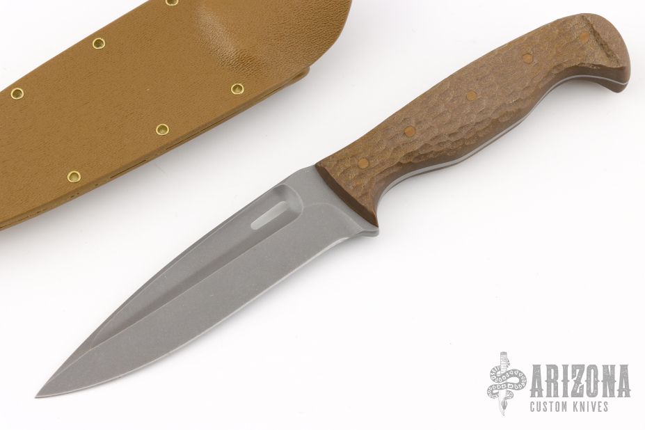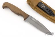 Approximately 8.25" Overall w/ 4.25" Blade Length. Handles are Tan medium-thick Jigged Texture Micarta w/ Center Palm Swell & Pommel Flare Contours. 5/32" thick MagnaCut Blade w/ Double Edge Dagger Grind and Matte Field Finish. Includes Field Tan Tracker Dan Sheath