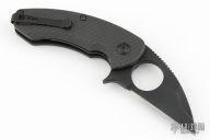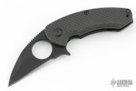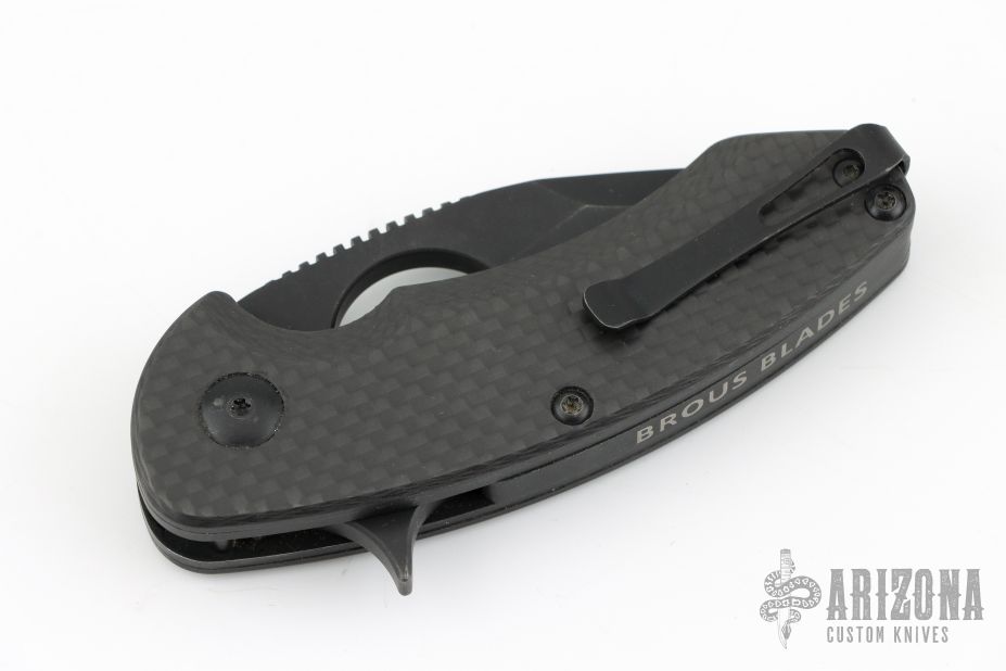 This Silent Soldier by Brous Blades features a black wharncliffe style blade with swedge, notched thumb rest, finger hole and flipper. The handle is comprised of carbon fiber scales over black coated titanium liners and blackened steel backspacer. Black coated steel tip down clip. Marked "458/500" inside backspacer. Comes with original box, papers and COA dated June 12 2013. Has a couple light scuffs and scratches, otherwise Excellent condition.