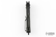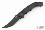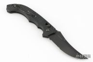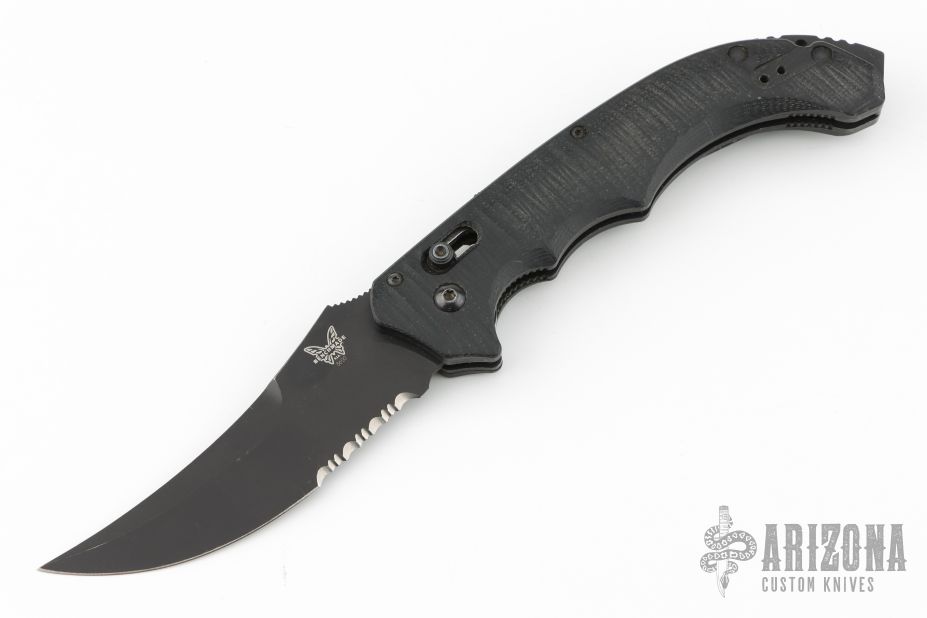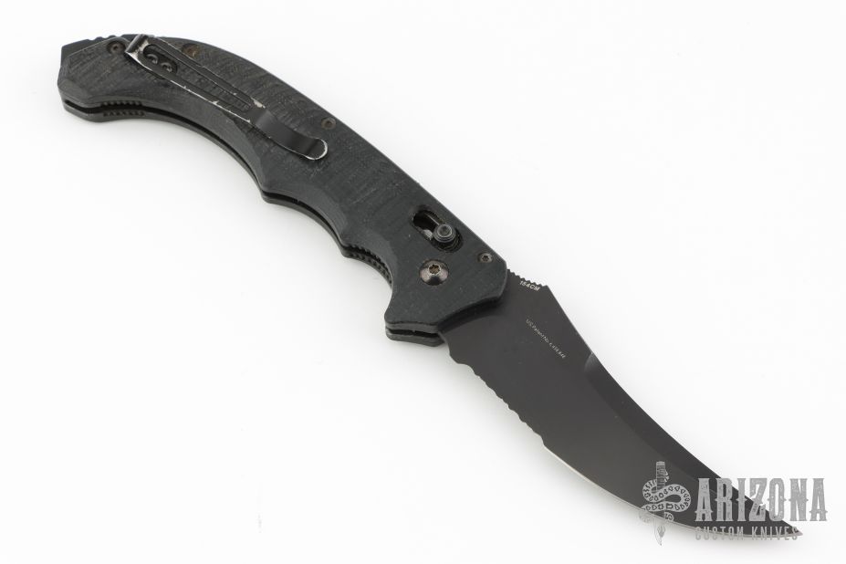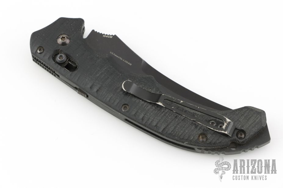 Well-balanced, symmetrical, eye-catching, The Bedlam has a black coated 154CM partially serrated blade that is released with the AXIS locking button. Safety on top of knife. Sculpted black G10 handle fits comfortably and securely. Reversible tip up black clip. Has some scuffs and scratches, otherwise good condition.