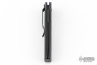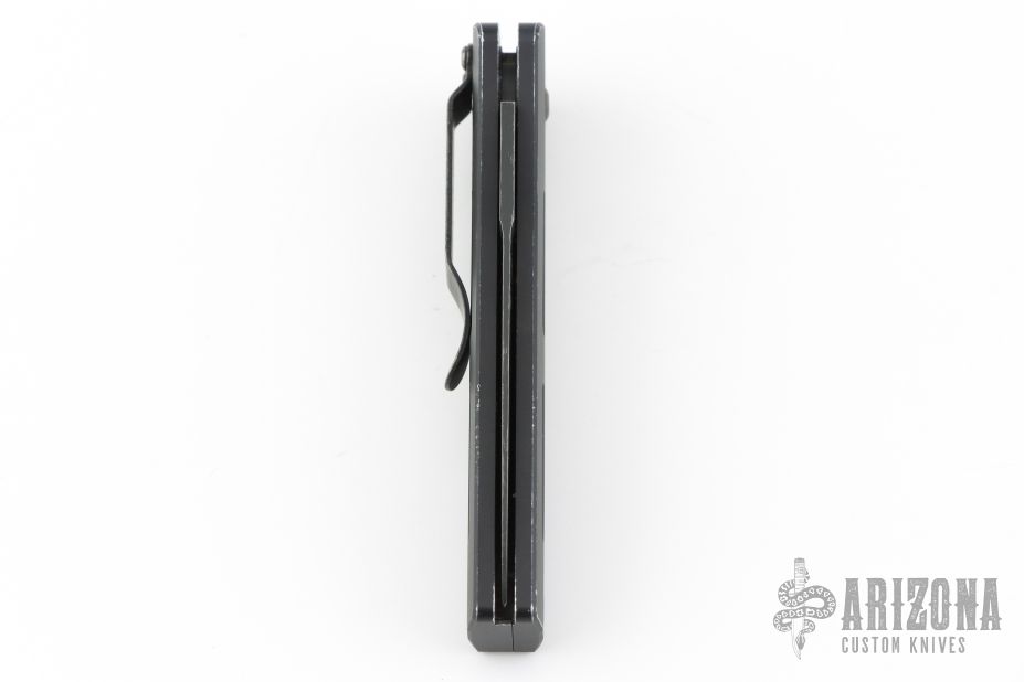 This 3550 Mini Stimulus features a black spear point blade with false top edge and a black aluminum handle with push button and safety, tip up or down reversible black stainless steel clip, lanyard hole at the butt. Has some scuffs, and some wear on the frame finish, otherwise good user condition.