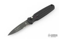 This Mini Covert Auto by Gerber features a black spear-point partially serrated blade and a notched thumbrest. Has a black aluminum handle with a and safety. Black stainless steel clip, tip down clip. Excellent condition.