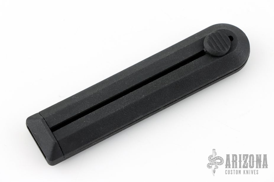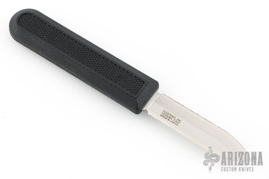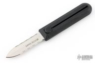 This is an original Cold Steel ER-1 (#32SP) Emergency Rescue Knife. It is no longer manufactured. It features a patented sliding lock mechanism that offers an easily accessible blade in a very safe package. When closed, the razorsharp blade is locked securely inside a tough Zytel® housing. To open: simply slide the button forward until it snaps into place. Once in the open position the ER1 has been laboratory certified to withstand at least 50 lbs of pressure on the point without collapsing and yet the whole package weighs a featherlight 1.6 ounces. The blade is hollow ground and double edged, and has Cold Steel's exclusive serration pattern for smooth longlasting cutting power. This is particularly useful in accident situations for cutting away seat belts or heavy clothing, where a more pointed blade is less desirable.