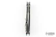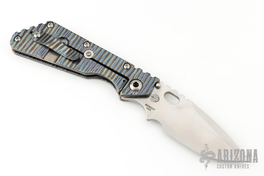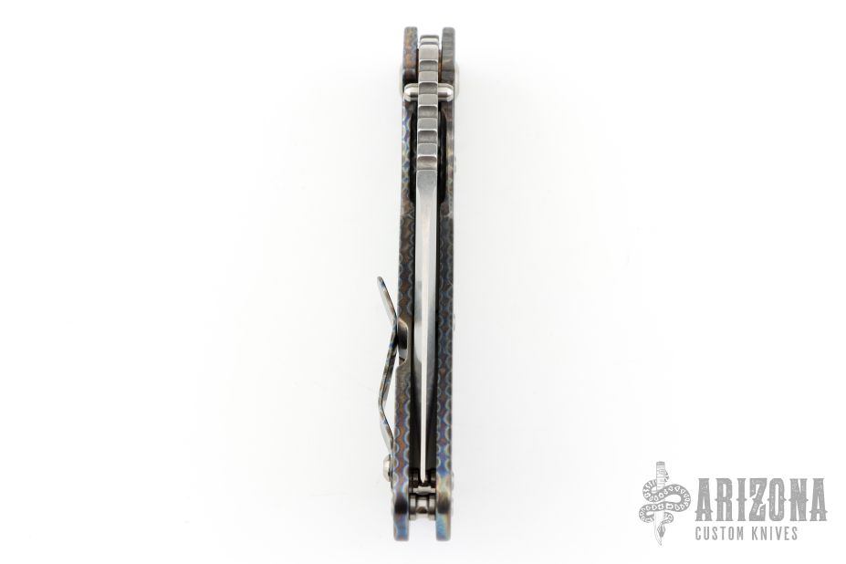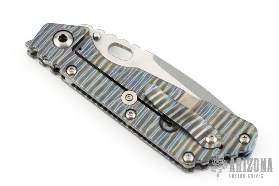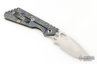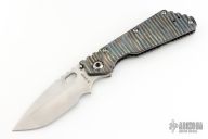 This Mick Strider Performance Series XL framelock folder features a hand ground stonewashed blade with thumbhole and notched thumbrest. The handle has a flamed and orange peel finished titanium frame with titanium clip, tip up carry. Jimping on blade spine. Includes Hinderer "Lock Bar Stabilizer" for maximum reverse lock retention. Nice detent, lockup and blade seating. Excellent condition.