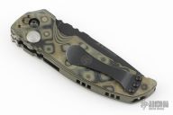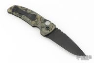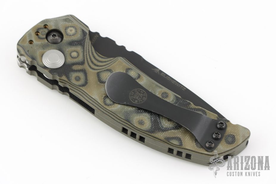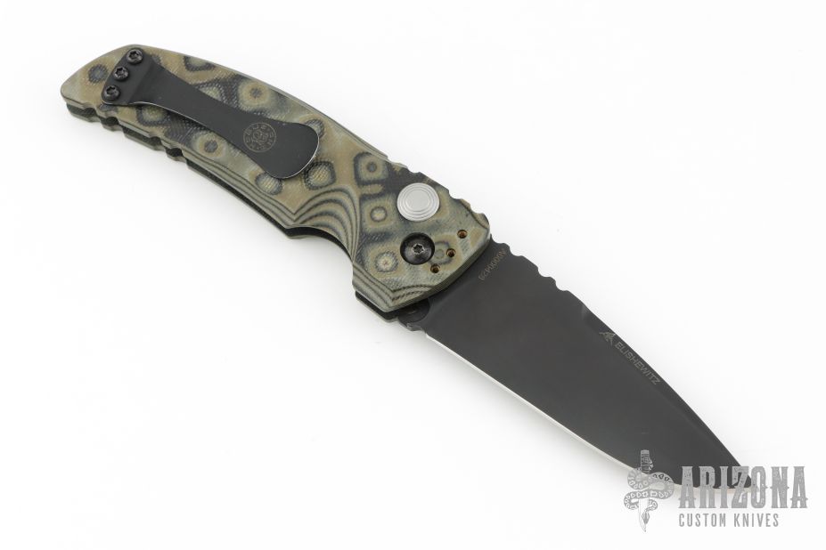 This Auto by Hogue features a black blade with notched thumbrest. The handle is "G-Mascus" G-10, tip up or down reversible black stainless steel clip. Has safety. Excellent condition. Comes with original box and papers.