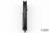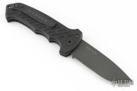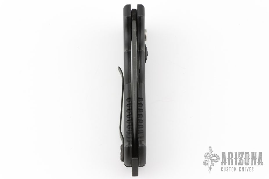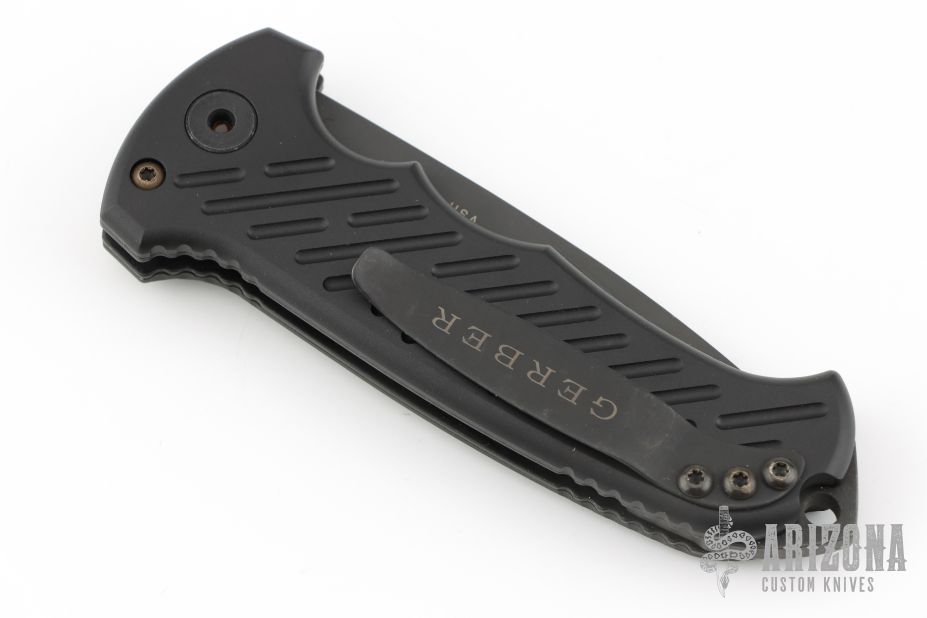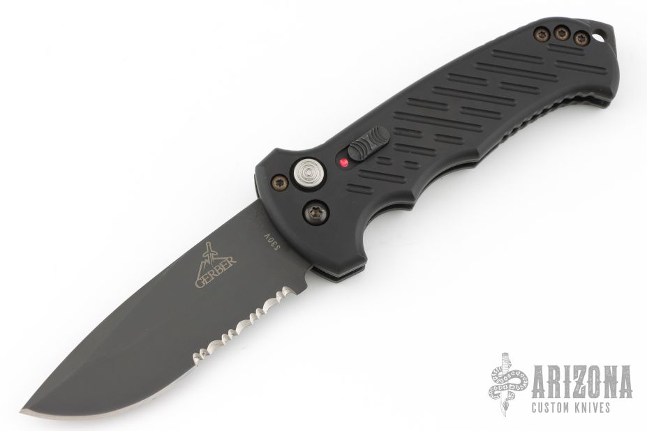 This 06 Side Opening Auto has a matte black finished S30V drop point blade with partial serrations. The handle is black aluminum over black stainless steel liners, exposed stainless steel tang butt/ glass breaker/ backspacer with lanyard hole, black stainless steel tip up (RH/LH reversible) clip, and safety button. Comes with original belt sheath. Has some light scuffs, otherwise excellent condition.