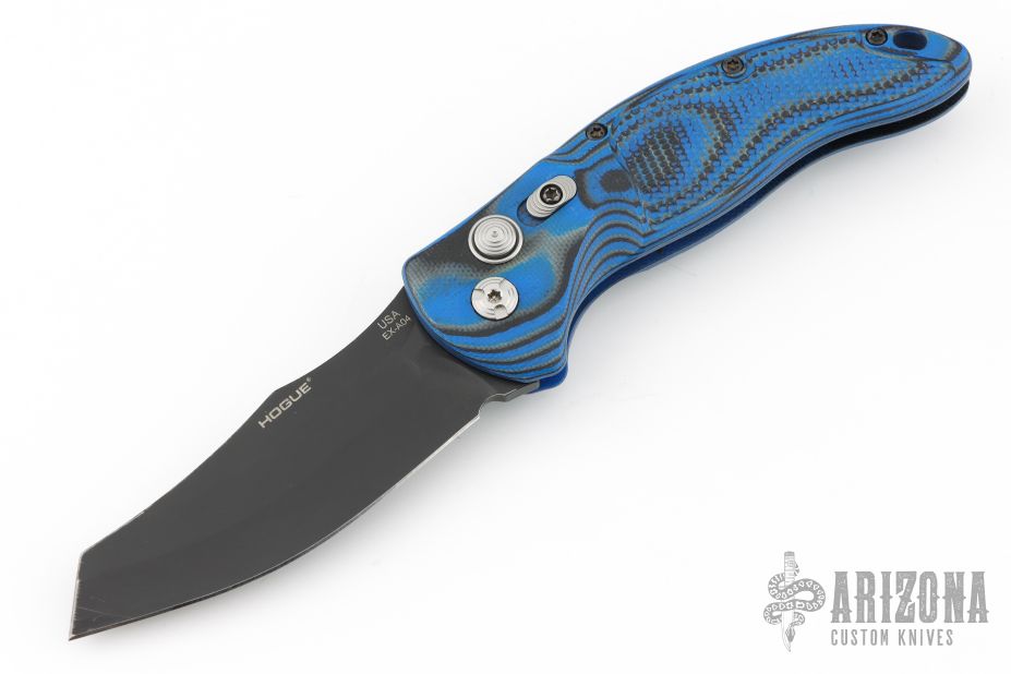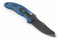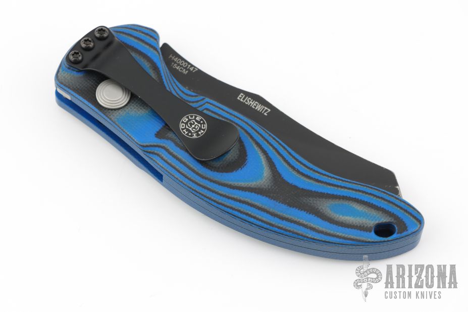 This Elishewitz design auto features a black recurve blade. The handle has black/grey/blue G-10 frame with safety. Has black stainless steel pocket clip and lanyard at the butt. Has some scuffs and wear on the blade finish, otherwise good condition.