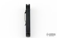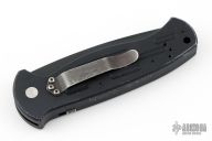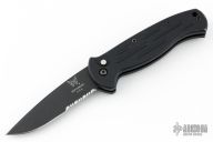 This AFO Automatic from Benchmade features a black drop point blade with swedge and partial serrations. The handle has black aluminum with a lanyard hole in pommel. Tip up or down reversible clip. Has some scuffs and scratches, has some wear on the frame, otherwise good condition. Has "NJJG 2944" scratches into the spine of the handle.