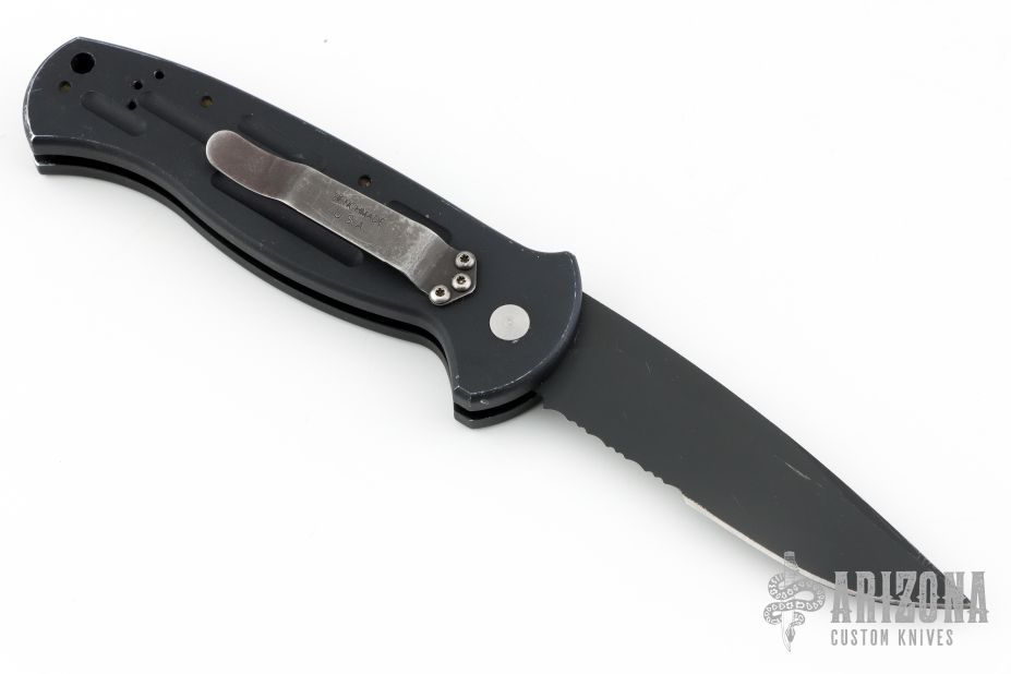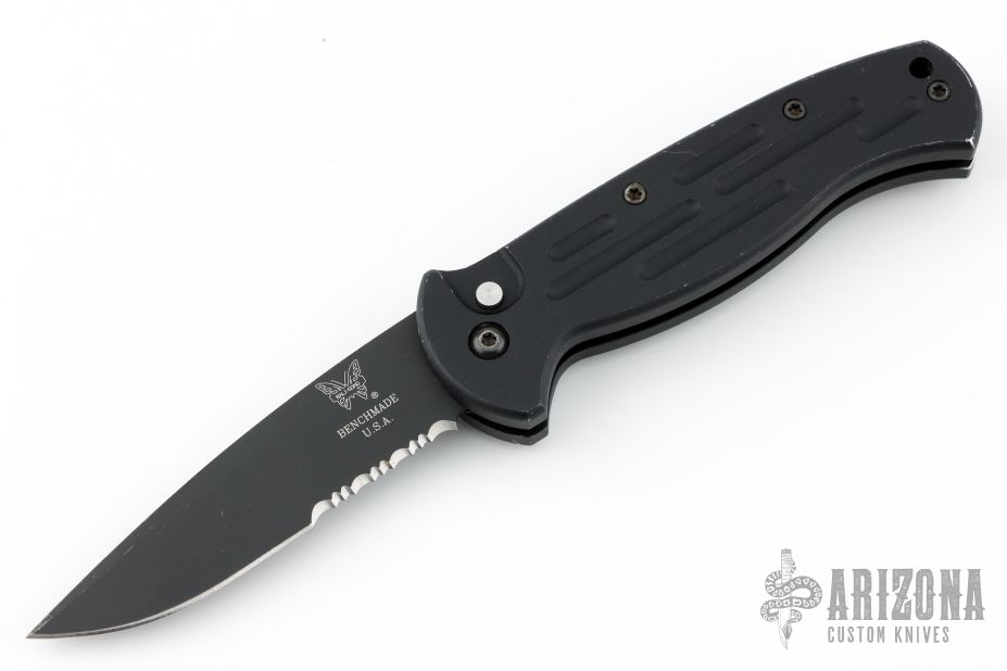 This AFO Automatic from Benchmade features a black drop point blade with swedge and partial serrations. The handle has black aluminum with a lanyard hole in pommel. Tip up or down reversible clip. Has some scuffs and scratches, has some wear on the frame, otherwise good condition. Has "NJJG 2944" scratches into the spine of the handle.