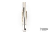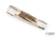 This Barry Wood swing lock folder features a satin finish blade and satin finish stainless steel frame with sambar stag scales. This is a very unique scissor opening folder, which when the blade is fully open and locked in place is almost a fixed blade knife. The handle is nicely contoured for a comfortable grip. Opening is accomplished by lightly pressing down and outward at the rear indentation on the spine, which releases the locking pin and allows one side of the handle and the blade to rotate down then forward until the blade locks in the forward position. The one side of the handle continues to rotate back until it locks in place. Closing requires the same slight thumb pressure at the indentation to release the locking pin, then the one side of the handle is rotated back and around, catching the blade and aligning both with the other side of the handle in a locked closed position.