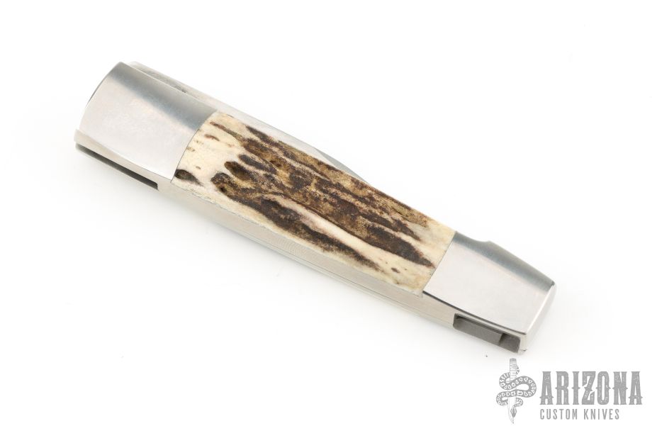 This Barry Wood swing lock folder features a satin finish blade and satin finish stainless steel frame with sambar stag scales. This is a very unique scissor opening folder, which when the blade is fully open and locked in place is almost a fixed blade knife. The handle is nicely contoured for a comfortable grip. Opening is accomplished by lightly pressing down and outward at the rear indentation on the spine, which releases the locking pin and allows one side of the handle and the blade to rotate down then forward until the blade locks in the forward position. The one side of the handle continues to rotate back until it locks in place. Closing requires the same slight thumb pressure at the indentation to release the locking pin, then the one side of the handle is rotated back and around, catching the blade and aligning both with the other side of the handle in a locked closed position.