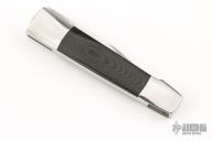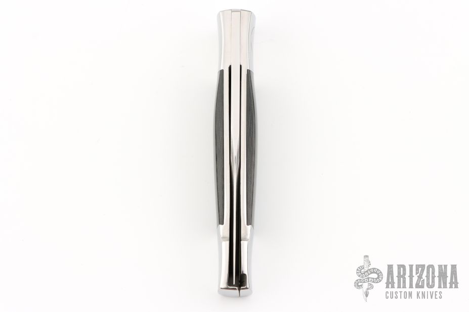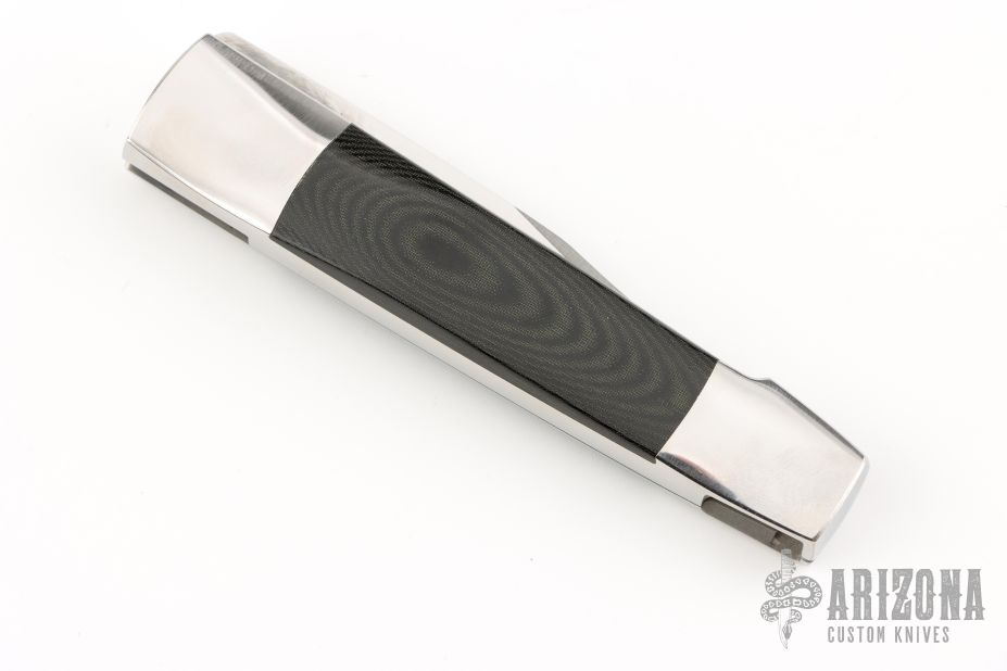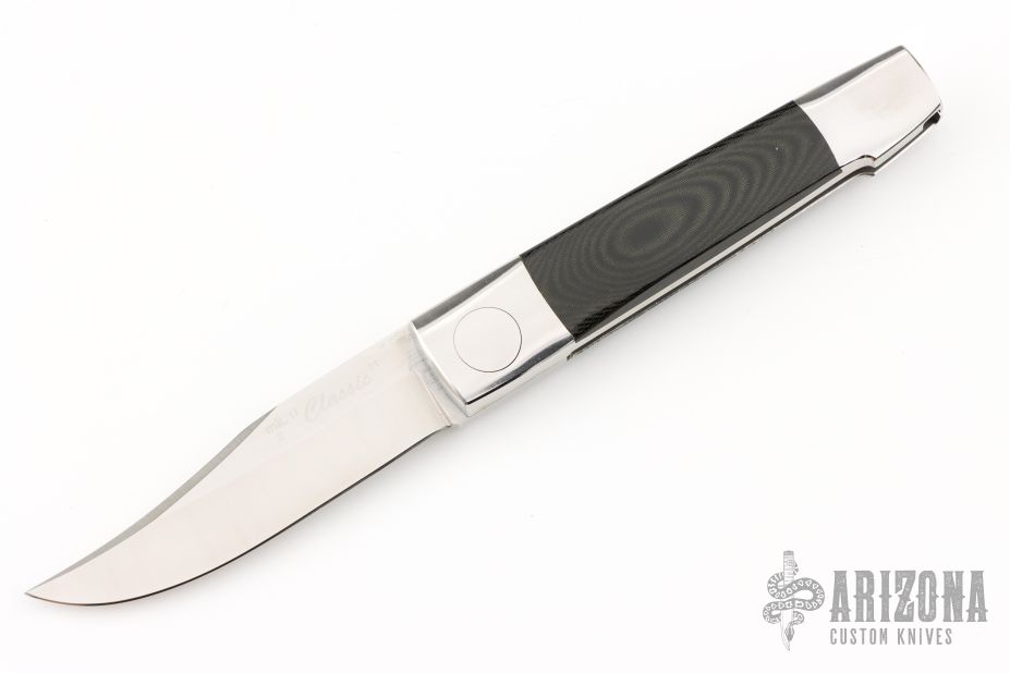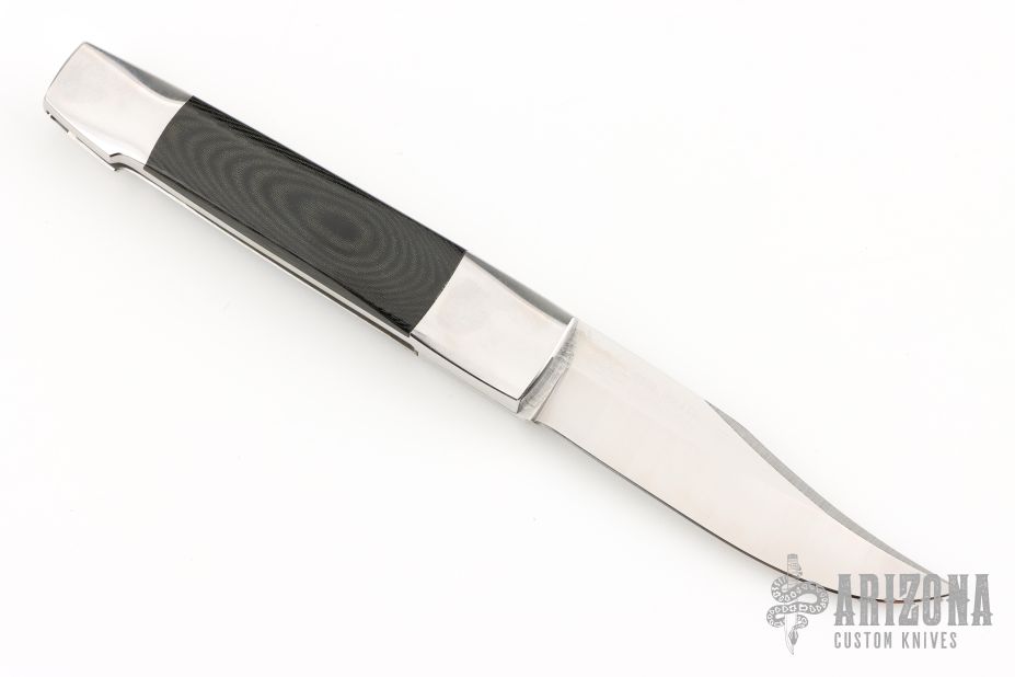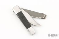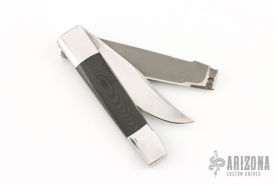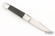 This Barry Wood swing lock folder features a satin finish blade and satin finish stainless steel frame with micarta scales. This is a very unique scissor opening folder, which when the blade is fully open and locked in place is almost a fixed blade knife. The handle is nicely contoured for a comfortable grip. Opening is accomplished by lightly pressing down and outward at the rear indentation on the spine, which releases the locking pin and allows one side of the handle and the blade to rotate down then forward until the blade locks in the forward position. The one side of the handle continues to rotate back until it locks in place. Closing requires the same slight thumb pressure at the indentation to release the locking pin, then the one side of the handle is rotated back and around, catching the blade and aligning both with the other side of the handle in a locked closed position.