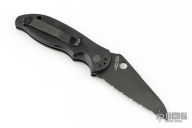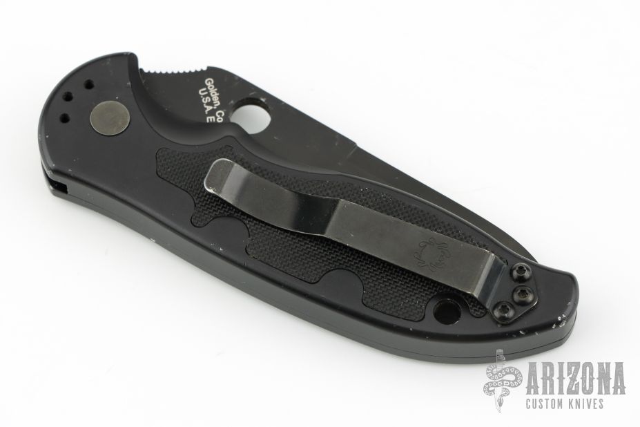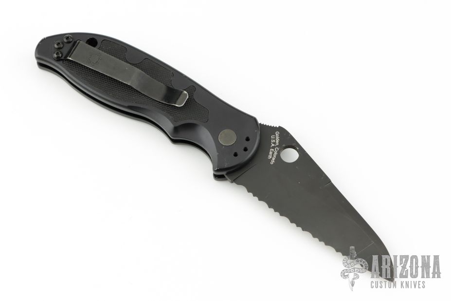 This C121PBK Embassy from Spyderco features a black sheepsfoot fully serrated blade with swedge, small thumbhole and notched thumb ramp. The handle has an aluminum frame with black G10 inlays. Lanyard hole in pommel. Reversible black coated stainless steel tip up clip. Blade is deployed via push button with fast coil spring action. Sliding safety on "A" side of handle. Has some scratches and scuffs, otherwise good condition.