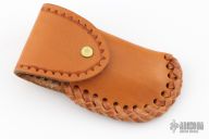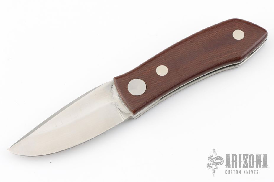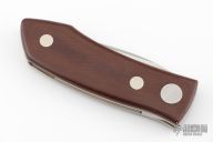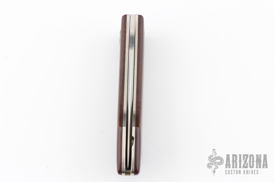 This Barry Wood swing lock folder features a satin finish blade and satin finish stainless steel frame with maroon micarta scales. This is a very unique scissor opening folder, which when the blade is fully open and locked in place is almost a fixed blade knife. The handle is nicely contoured for a comfortable grip. Opening is accomplished by lighting pressing down and outward at the rear indentation on the spine, which releases the locking pin and allows one side of the handle and the blade to rotate down then forward until the blade locks in the forward position. The one side of the handle continues to rotate back until it locks in place. Closing requires the same slight thumb pressure at the indentation to release the locking pin, then the one side of the handle is rotated back and around, catching the blade and aligning both with the other side of the handle in a locked closed position. Numbered #333 inside frame.