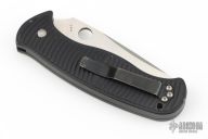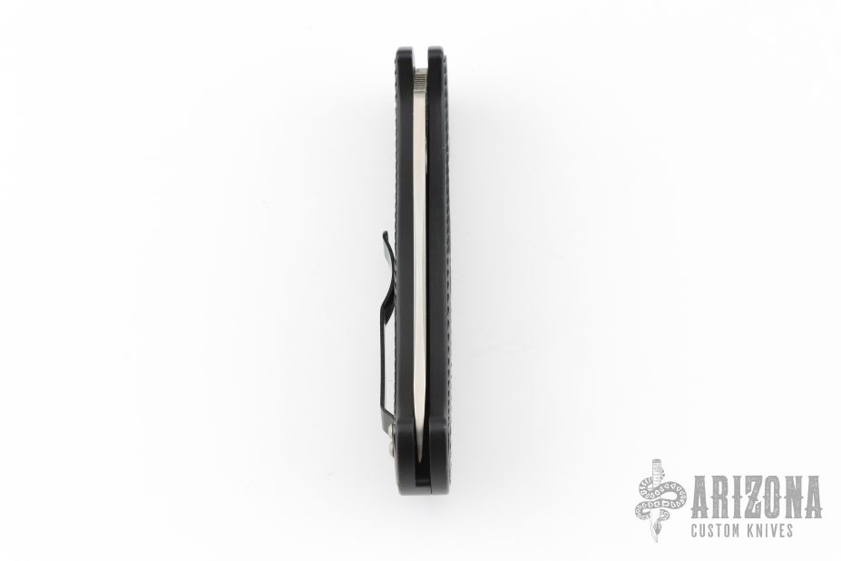 This side opening automatic features a satin finished blade with sedge, thumbhole and notched thumb ramp. Frame is milled and textured black aluminum with push button and safety. Clip is tip up carry, and reversible for right or left-handed carry. Has some scratches and scuffs, good condition otherwise.