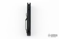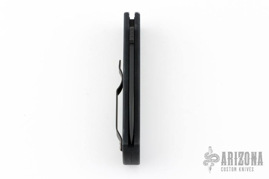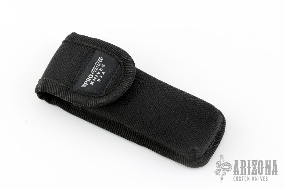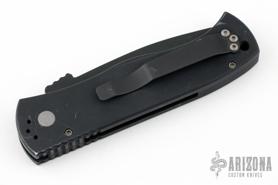 This CQC7A by Pro-Tech Knives is an Emerson design, it features a black spearpoint blade with notched thumbrest. The handle has a black aluminum frame with lanyard hole, black tip up stainless steel clip and blasted hardware. Comes with original sheath. Production Run 1 #460. Has some scuffs and scratches, has some wear on the frame finish, otherwise good condition.