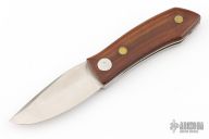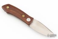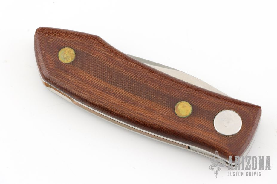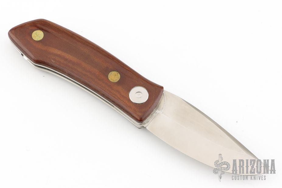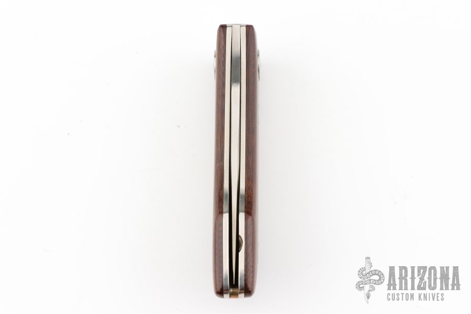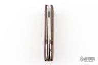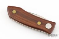 This Barry Wood swing lock folder features a satin finish blade and satin finish stainless steel frame with maroon micarta scales. This is a very unique scissor opening folder, which when the blade is fully open and locked in place is almost a fixed blade knife. The handle is nicely contoured for a comfortable grip. Opening is accomplished by lighting pressing down and outward at the rear indentation on the spine, which releases the locking pin and allows one side of the handle and the blade to rotate down then forward until the blade locks in the forward position. The one side of the handle continues to rotate back until it locks in place. Closing requires the same slight thumb pressure at the indentation to release the locking pin, then the one side of the handle is rotated back and around, catching the blade and aligning both with the other side of the handle in a locked closed position. Numbered #207 inside frame.