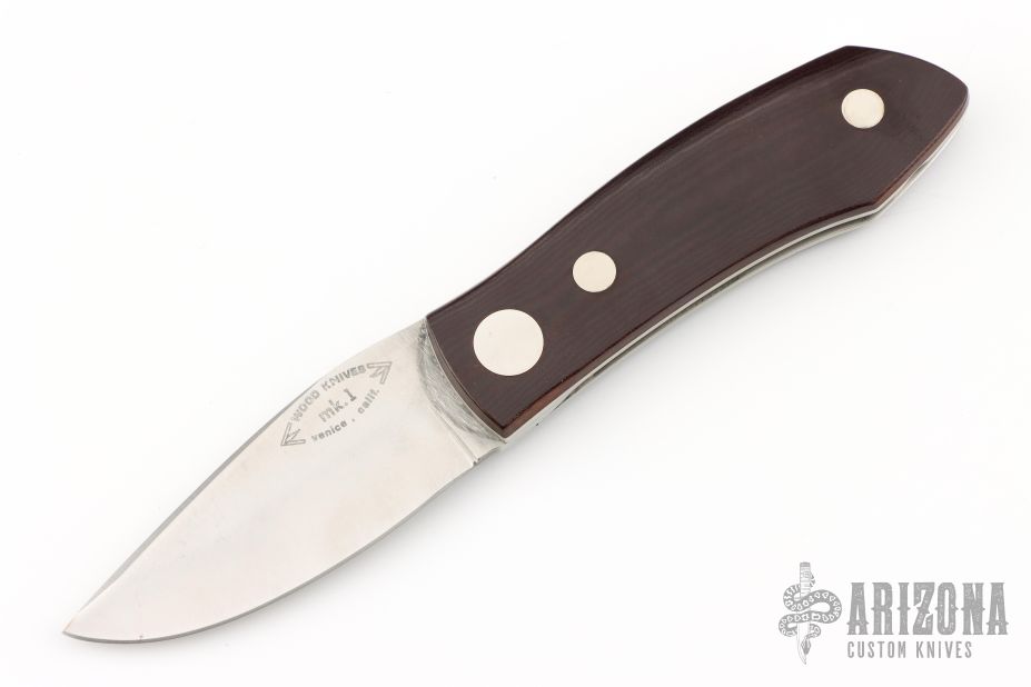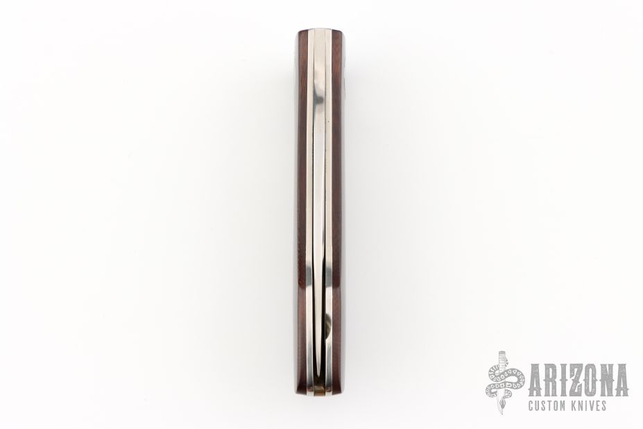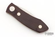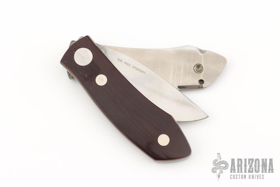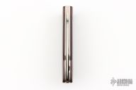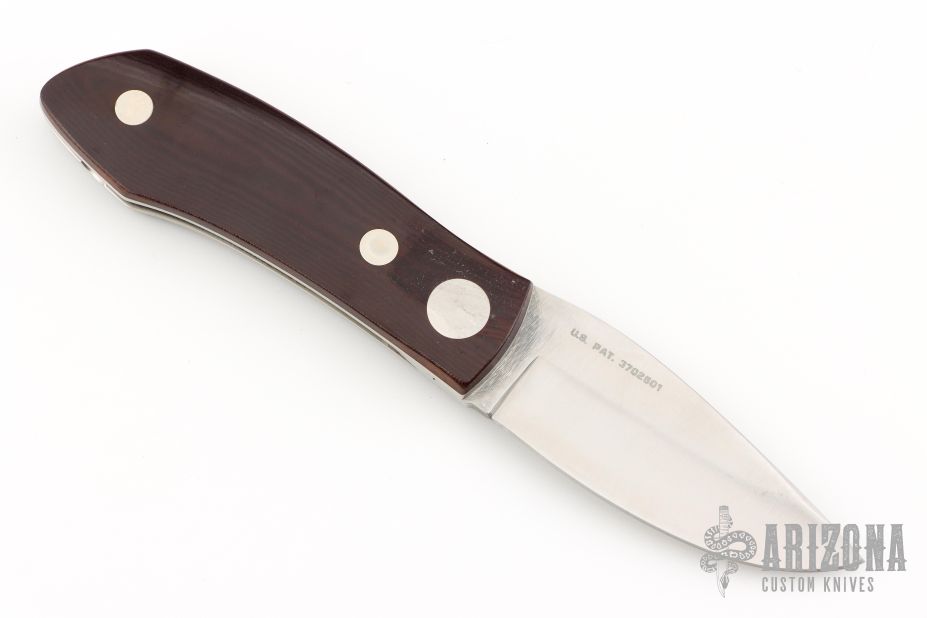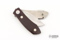 This Barry Wood swing lock folder features a satin finish blade and satin finish stainless steel frame with maroon micarta scales. This is a very unique scissor opening folder, which when the blade is fully open and locked in place is almost a fixed blade knife. The handle is nicely contoured for a comfortable grip. Opening is accomplished by lighting pressing down and outward at the rear indentation on the spine, which releases the locking pin and allows one side of the handle and the blade to rotate down then forward until the blade locks in the forward position. The one side of the handle continues to rotate back until it locks in place. Closing requires the same slight thumb pressure at the indentation to release the locking pin, then the one side of the handle is rotated back and around, catching the blade and aligning both with the other side of the handle in a locked closed position.