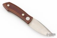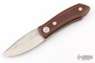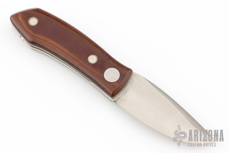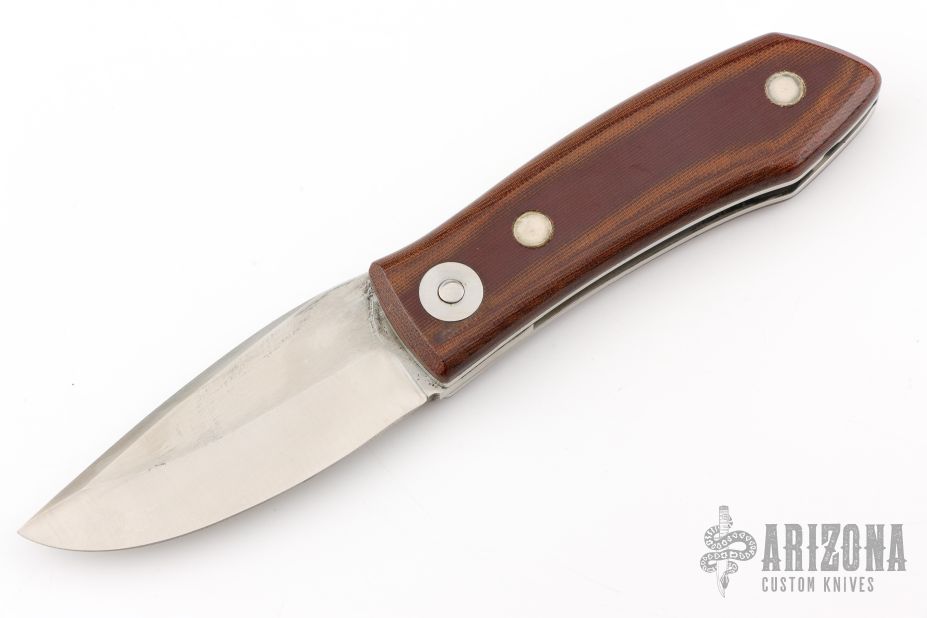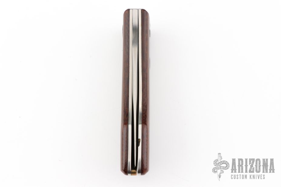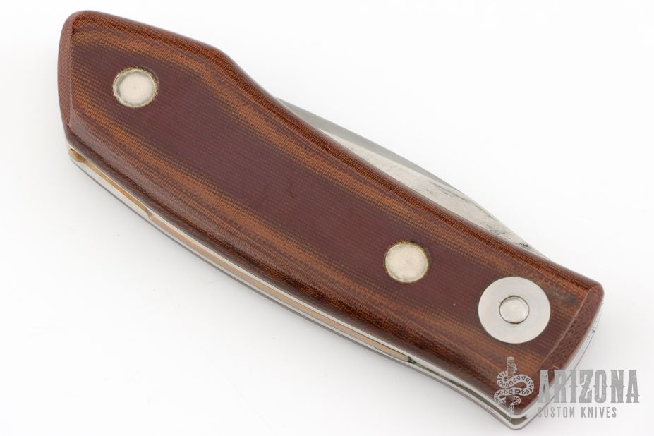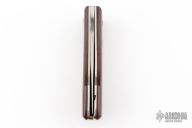 This Barry Wood swing lock folder features a satin finish blade and satin finish stainless steel frame with maroon micarta scales. This is a very unique scissor opening folder, which when the blade is fully open and locked in place is almost a fixed blade knife. The handle is nicely contoured for a comfortable grip. Opening is accomplished by lighting pressing down and outward at the rear indentation on the spine, which releases the locking pin and allows one side of the handle and the blade to rotate down then forward until the blade locks in the forward position. The one side of the handle continues to rotate back until it locks in place. Closing requires the same slight thumb pressure at the indentation to release the locking pin, then the one side of the handle is rotated back and around, catching the blade and aligning both with the other side of the handle in a locked closed position. Numbered #207 inside frame.