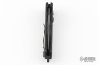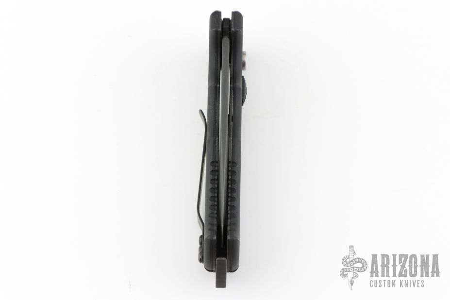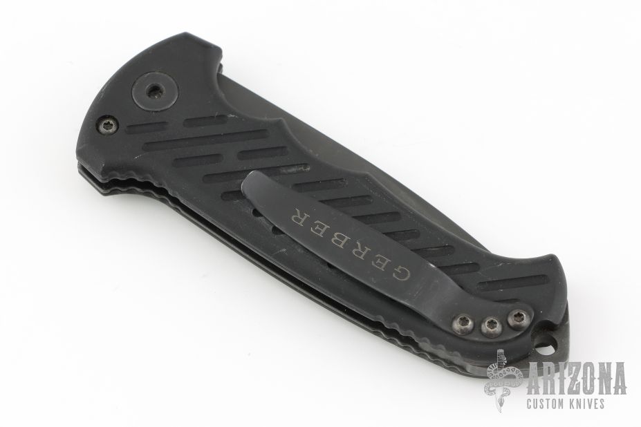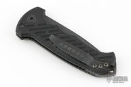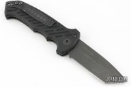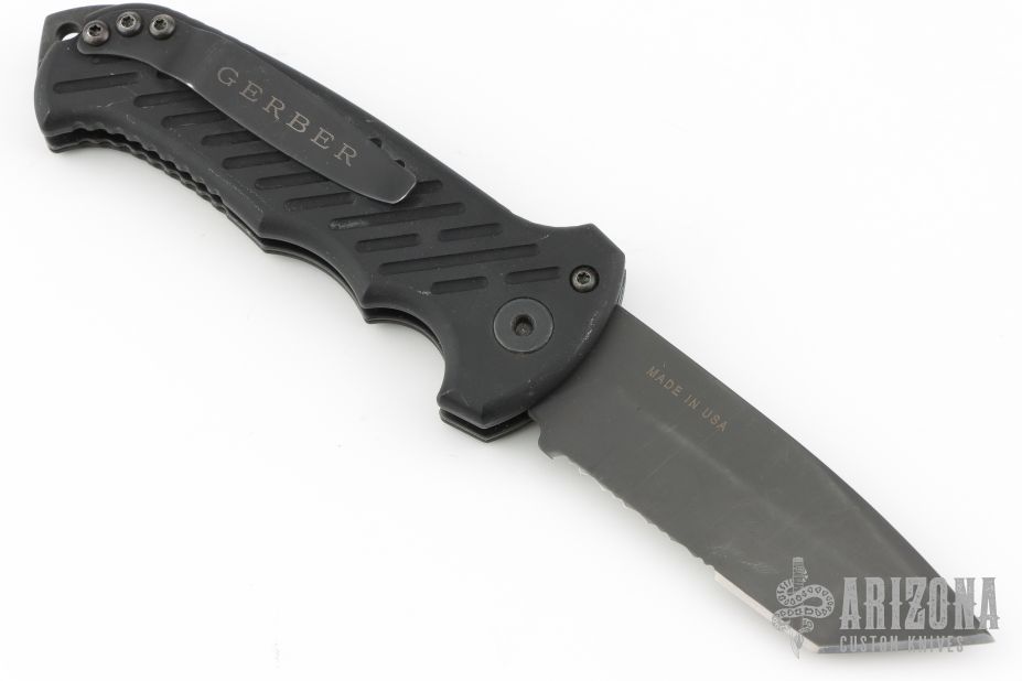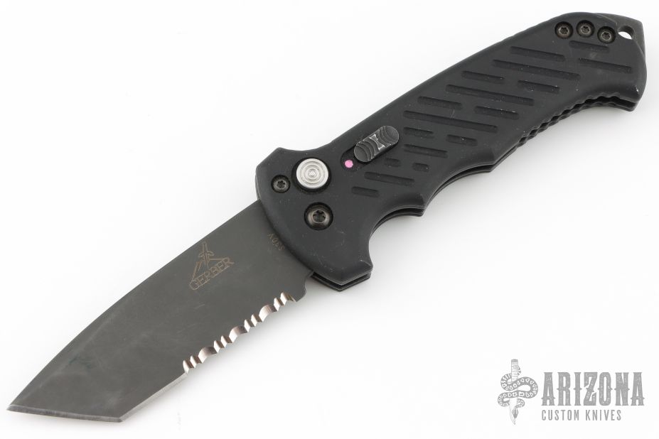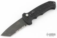 This 06 Side Opening Auto has a matte black finished S30V tanto partially serrated blade. Handle is black aluminum over black stainless steel liners, exposed stainless steel tang butt/ glass breaker/ backspacer with lanyard hole, black stainless steel tip up (RH/LH reversible) clip, and safety button. Has some scuffs and scratches, otherwise good condition.