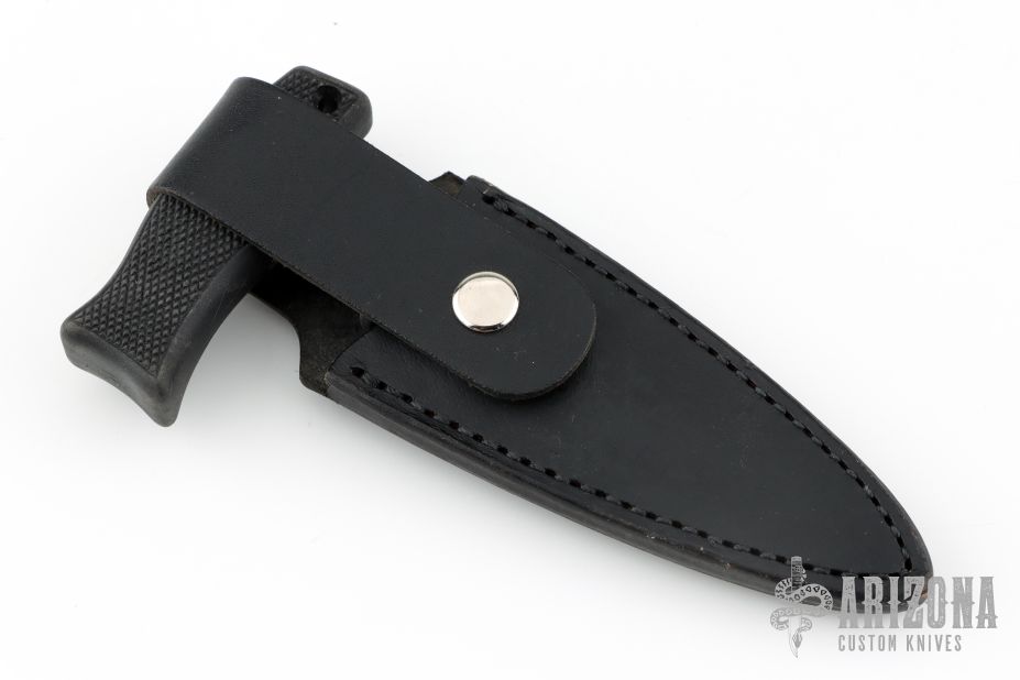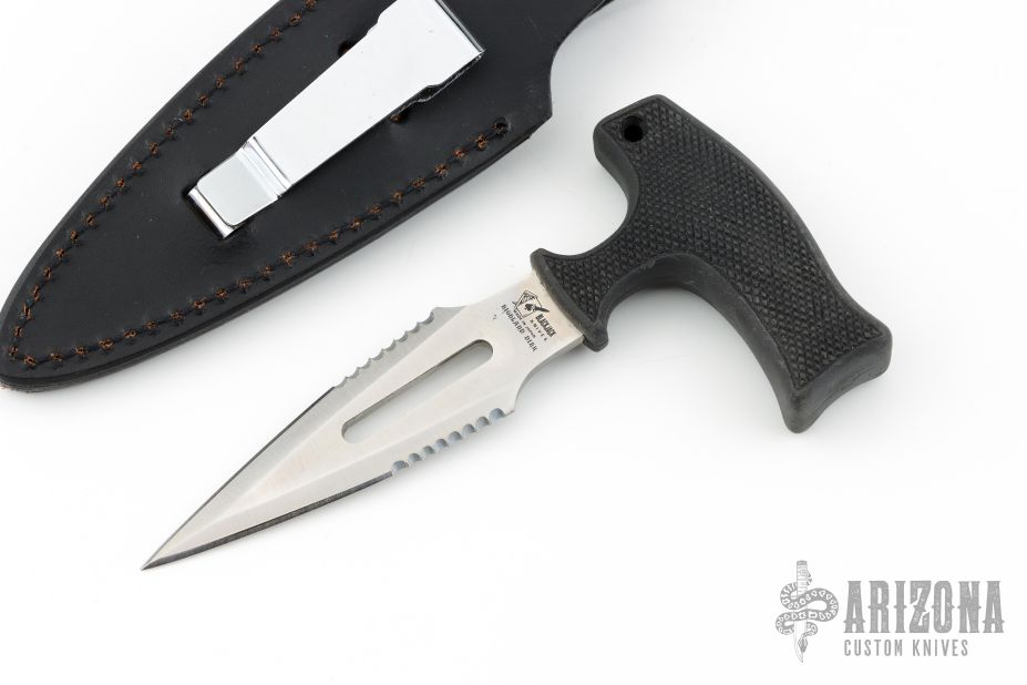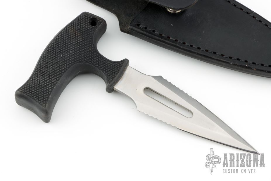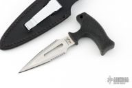 The Highland Dirk by Blackjack Knives features a satin finish partially serrated double edge blade, .138" blade stock and 1.101" blade depth, hidden tang construction. Kryton handle. Comes with black leather sheath. Excellent condition.