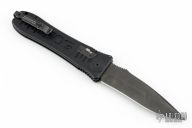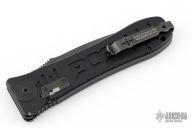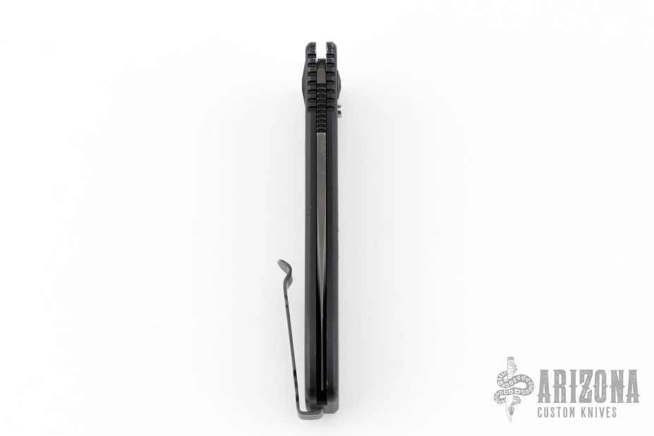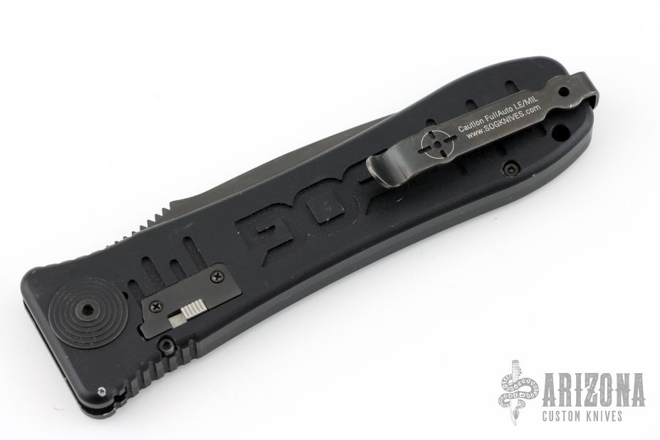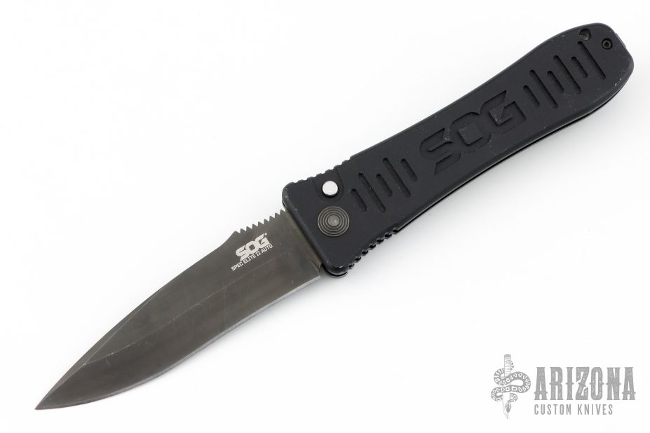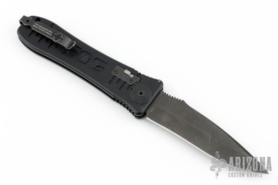 This Spec Elite II by SOG features a black recurve blade and black aluminum frame with notched thumbrest. Has safety and tip up black SS clip. Has a few marks/wear on the frame, otherwise good condition.