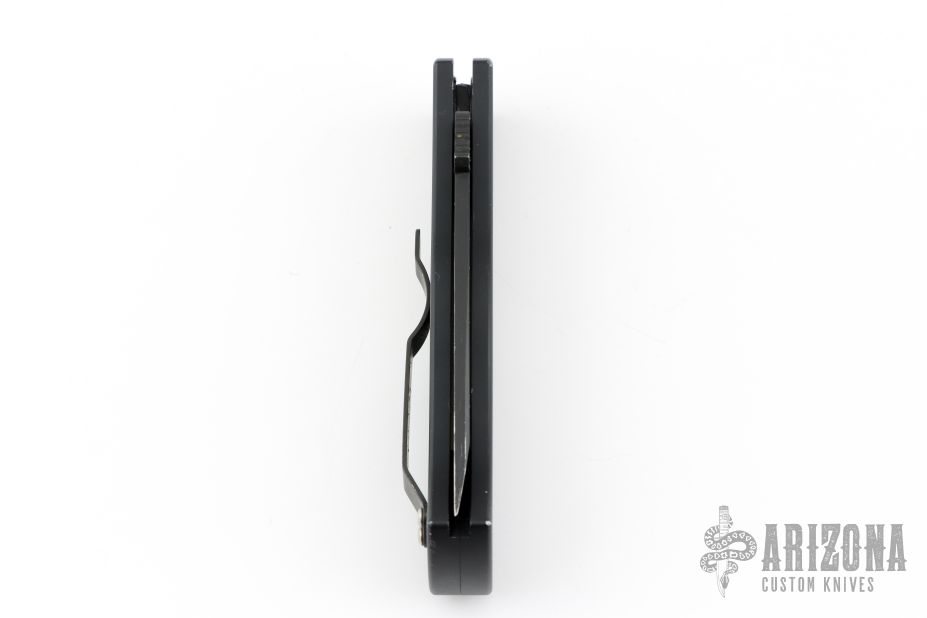This Emerson/Pro-Tech CQC7 automatic has a chisel ground two-tone blade with a plain edge and a solid black aluminum handle with Punisher logo. Black coated stainless steel clip. Coil spring. Has some scuffs and scratches, otherwise good user condition.