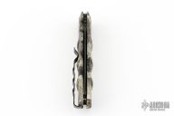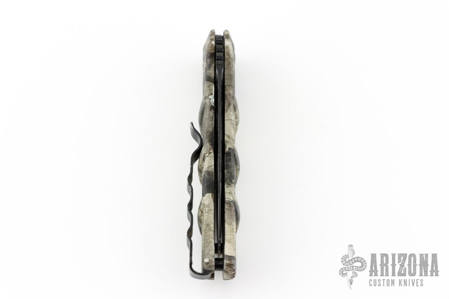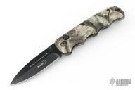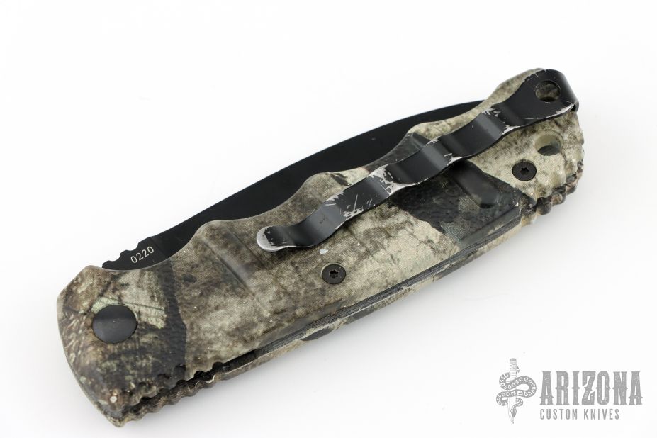 This Automat Kalashnikov 74 by Boker Plus a black spear point blade with a notched thumbrest. The handle has a camo aluminum frame with a black steel tip up pocket clip. Has some scuffs and scratches, has been used, good user condition.