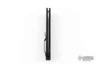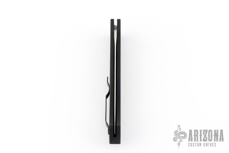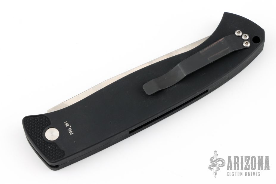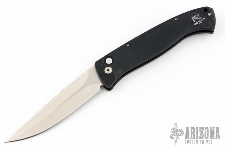 The Walter Brend designed/Pro-Tech collaboration - Brend Auto #1. Walter's and Pro-Tech's logos are on the face side of the frame. Side mount push button open/close. Contoured handle, solid action, and an awesome side deploy blade. Satin finished blade and black aluminum handle. Tip up black stainless steel clip. Has a couple light scuffs on the clip, excellent condition otherwise. Comes with a Protech box for the same model with a black blade, papers and black nylon sheath.