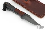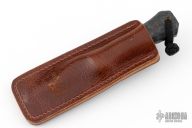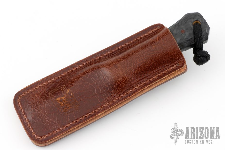 This Pocket Bowie by Auxiliary Manufacturing features an acid tumbled blade with .198" blade stock and 1.019" blade depth. The handle has Ironwood bolsters, carbon fiber scales, black liners, textured tang. Comes with a brown leather sheath with Ulti-clip. New from maker at the 2025 Blade Show Texas.