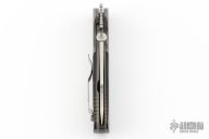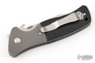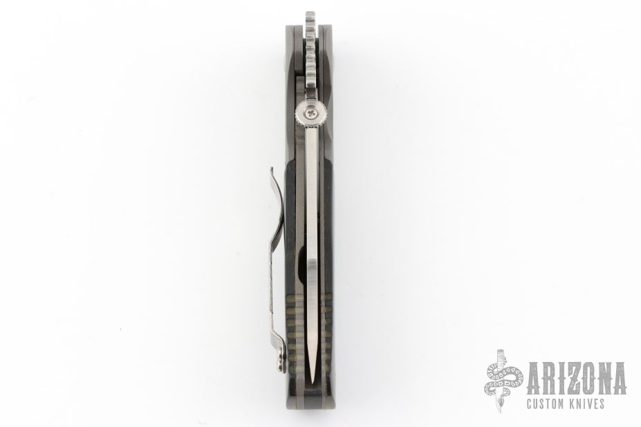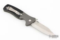 This custom CQC-45 by Ernie Emerson features a hand-ground satin finished blade with thumbdisc, notched thumbrest and wave feature. The handle has dovetailed bead blast titanium bolsters and liners, black paper micarta scales, black G-10 backspacer, and a tip up stainless steel clip. Comes with original box. Nice detent, lockup and blade seating. Has a very light scuff on the bolster, otherwise excellent condition.
