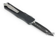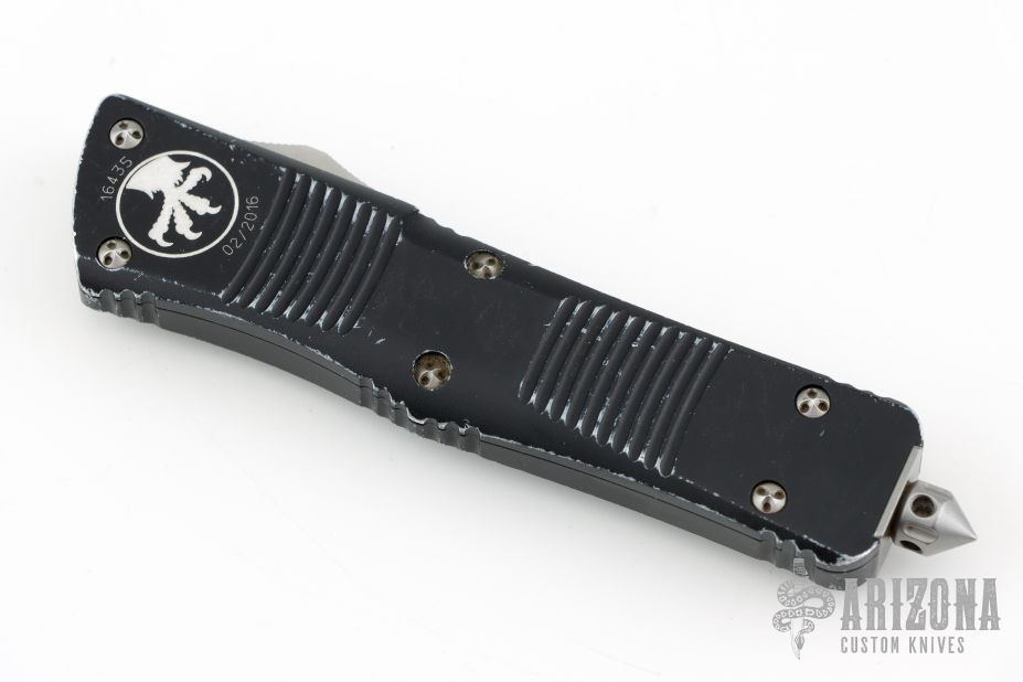 This Troodon by Microtech features a black double edged blade. Black aluminum handle with glass breaker and stainless steel clip. Dated 02/2016 and S/N 16435. Nice action and lockup. Has been used, has scuffs, scratches and dings, otherwise good user condition.
