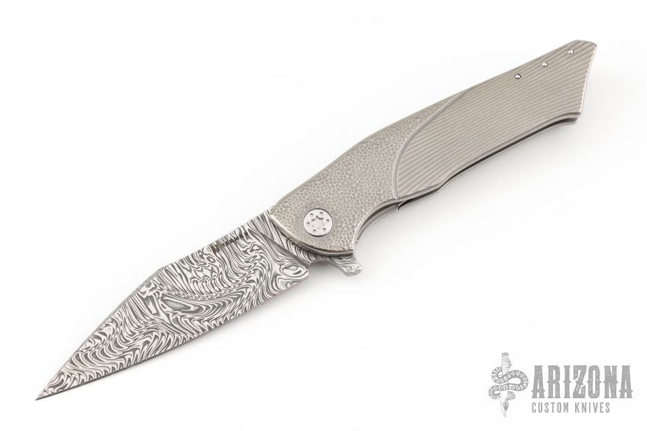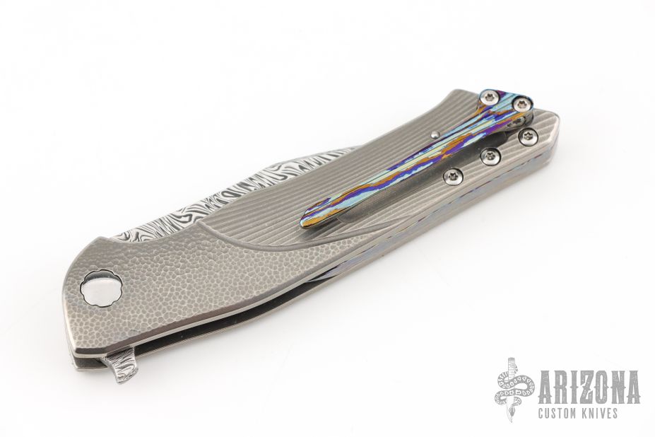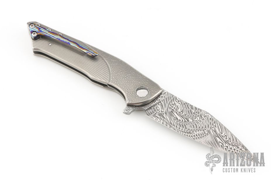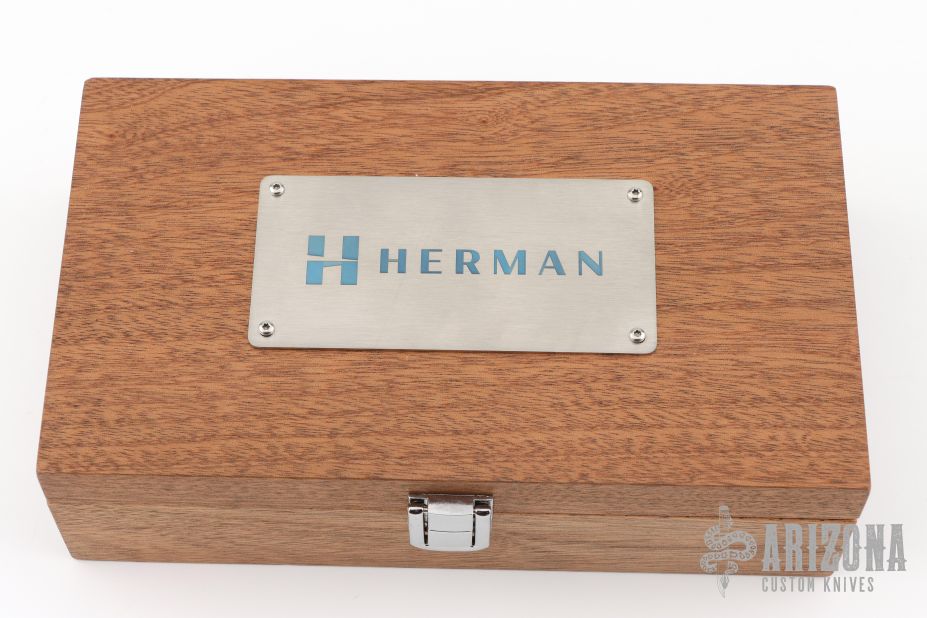 This Folder Bee Flipper by Herman Knives features a Damasteel blade with a flipper. The handle has a milled and textured titanium frame with titanium liner, timascus tip up clip and backspacer. Nice detent, lockup and blade seating. Rides on bearings.  Comes with original wooden box, COA dated 12/17/2024 #0135, and tool. Excellent condition.