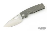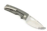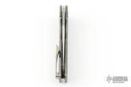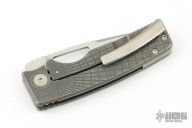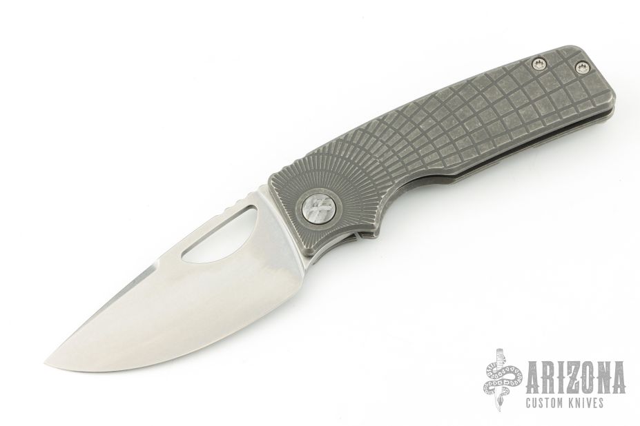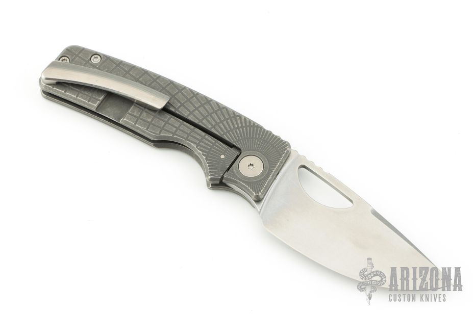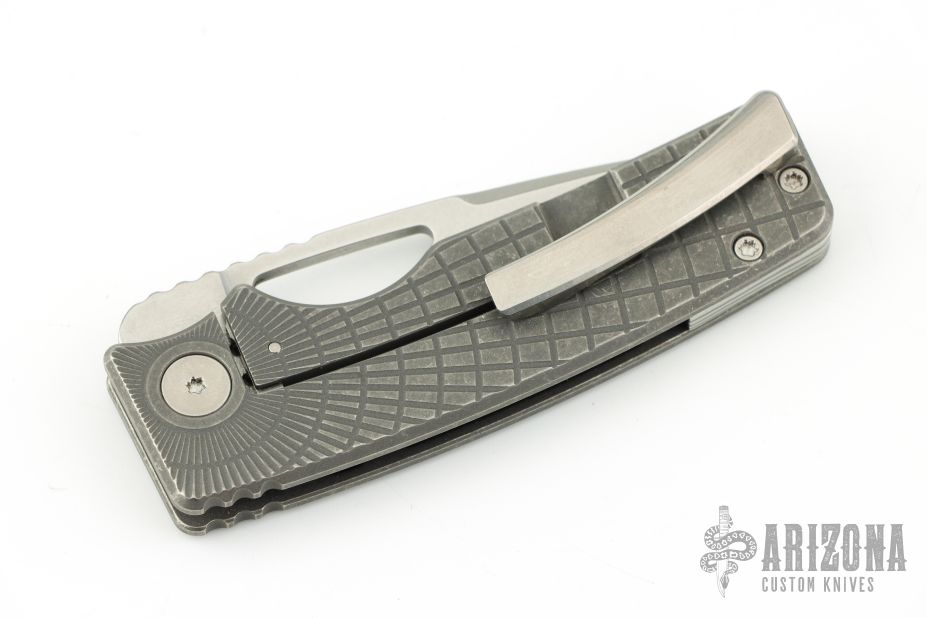 This knife by the OZ Machine Company features a stonewashed Magnacut blade with thumbhole and notched thumbrest. The handle features a dark stone wash finished radial frag milled titanium frame, custom metorite pivot, black timascus backspacer, titanium tip up pocket clip with hidden screws. Includes box and papers dated 5-18-23 and s/n 1768. Excellent condition. Comes with original pivot as well.