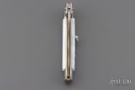 This Swivel Bolster by Frank Beltrame features a polished kris ground blade with false top edge. The handle has stainless steel bolsters, front and rear, pearlex scales, brass liners, stainless spring. Has a skull button and comes with a leather pocket sheath. Excellent condition.
