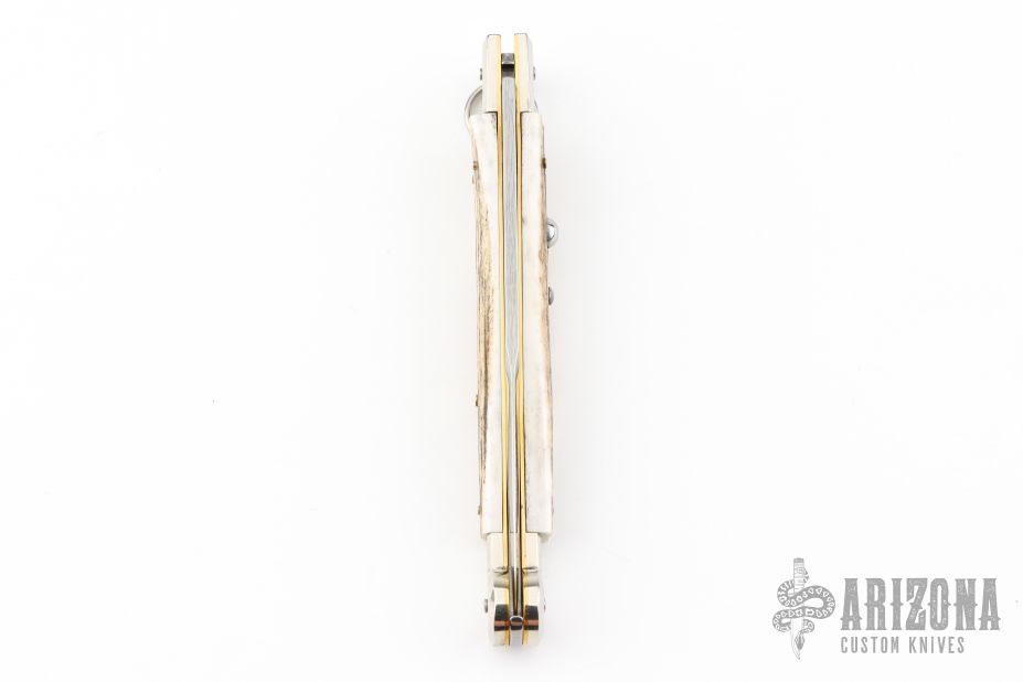 This 12" Sicilian Fighting Knife Ringpull Auto by AGA Campolin features a polished spear point blade. The handle has nickel silver bolsters, stag scales, brass liners and stainless steel backspacer. Has a ring pull. Comes with original COA and brown leather slip sheath. Excellent condition.