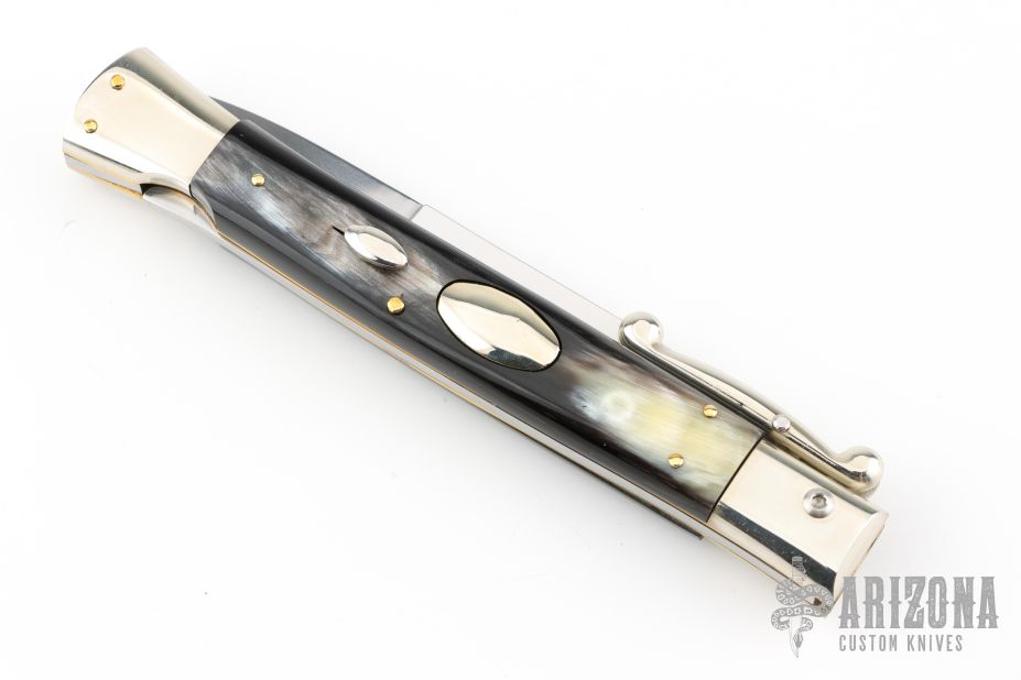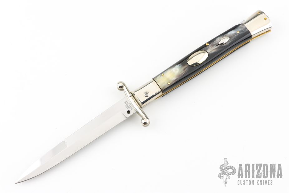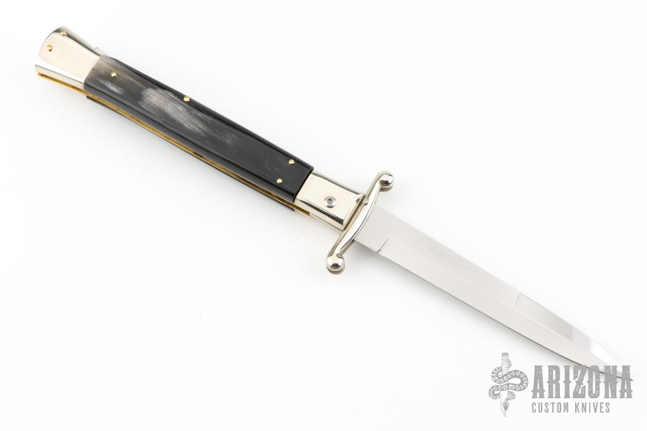 This 13" Heavy Frame Swinguard Auto from A.G.A. Campolin has a mirror polished stainless steel spear point blade with false top edge. Handle has buffalo horn scales with mirror polished nickel silver bolsters and pommel, brass liners, brass pins, stainless steel backspacer. Has a few light scratches, otherwise excellent condition. Comes with original leather slip sheath and COA.