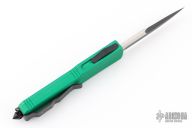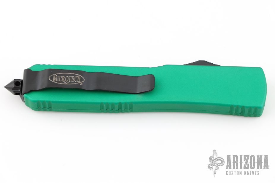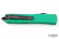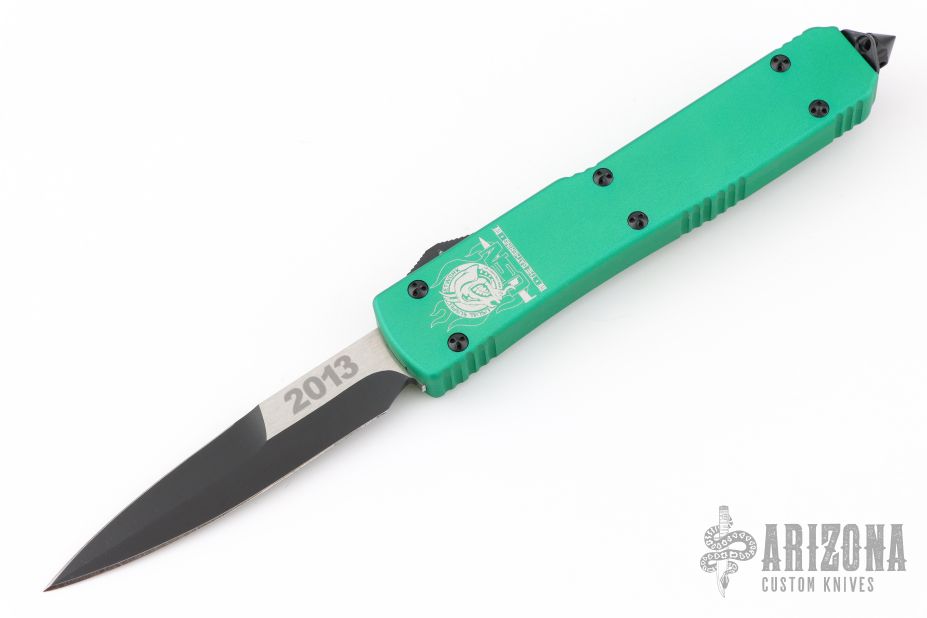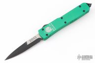 This Ultratech OTF automatic features a two tone D/E blade with satin flats, black grinds and a standard edge, and a green aluminum handle with black hardware. Glass breaker. Marked "USN 2013 G5" on blade. Comes with original box, drawstring pouch, and papers. New condition.