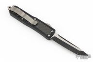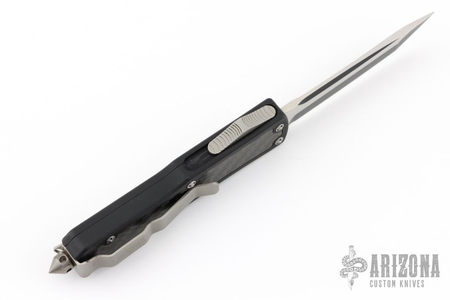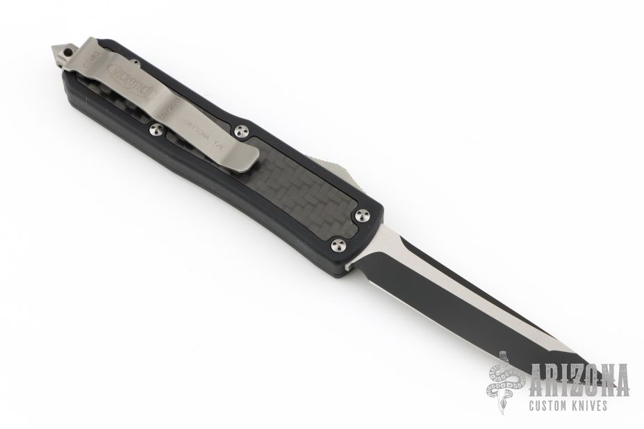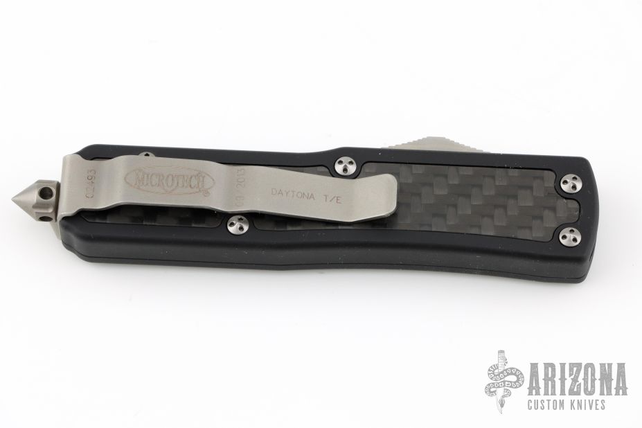 This Daytona T/E black standard #02493 09/2013 OTF auto has a black tanto blade. Handle is black anodized aluminum with carbon fiber inlays and bead blasted stainless steel tip up clip with glass breaker. Action is very responsive. New condition. Comes with original box, sheath and paperwork.