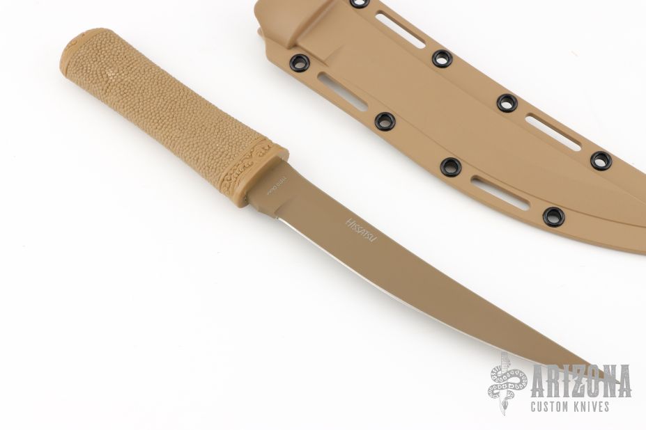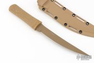 This Hissatsu Fixed Blade has a tan finished upswept blade with hidden tang. 3/16" blade stock, 15/16" depth. Handle is molded GFN. Comes with Kydex sheath and original box. Excellent condition.